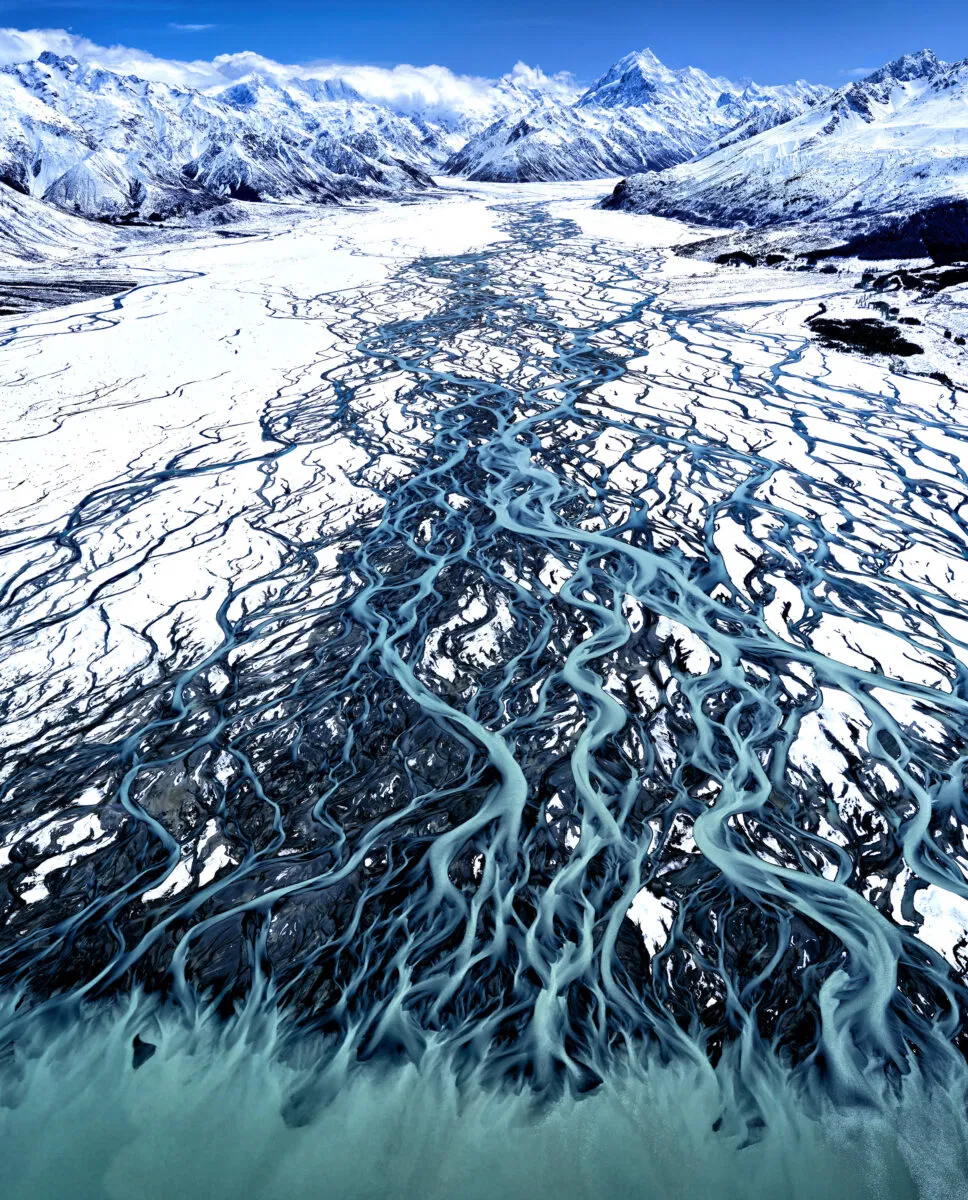 „Ein atemberaubendes, gemäldeartiges Bild, das die unglaubliche Schönheit der Gletscherlandschaften Neuseelands perfekt einfängt. Die verzweigten Kanäle des Tasman River bilden einen atemberaubenden Wandteppich aus türkisfarbenen Farbtönen vor dem schneebedeckten Gelände, während Aoraki/Mount Cook in der Ferne einen markanten Blickfang darstellt. Perfekt gerahmt und komponiert, ist der erhöhte Winkel fachmännisch gewählt – hoch genug, um eine dramatische Perspektive zu liefern, aber nicht so hoch, dass das Bild zweidimensional wirkt, wodurch die Tiefe und Form dieser majestätischen Landschaft erhalten bleibt.“ - The Independent Photographer Texteditoren