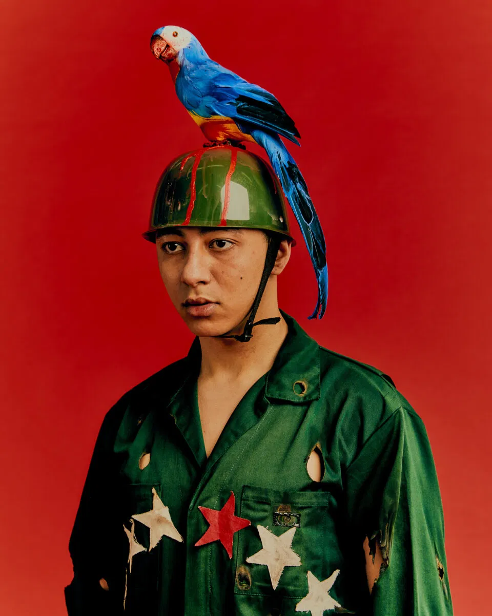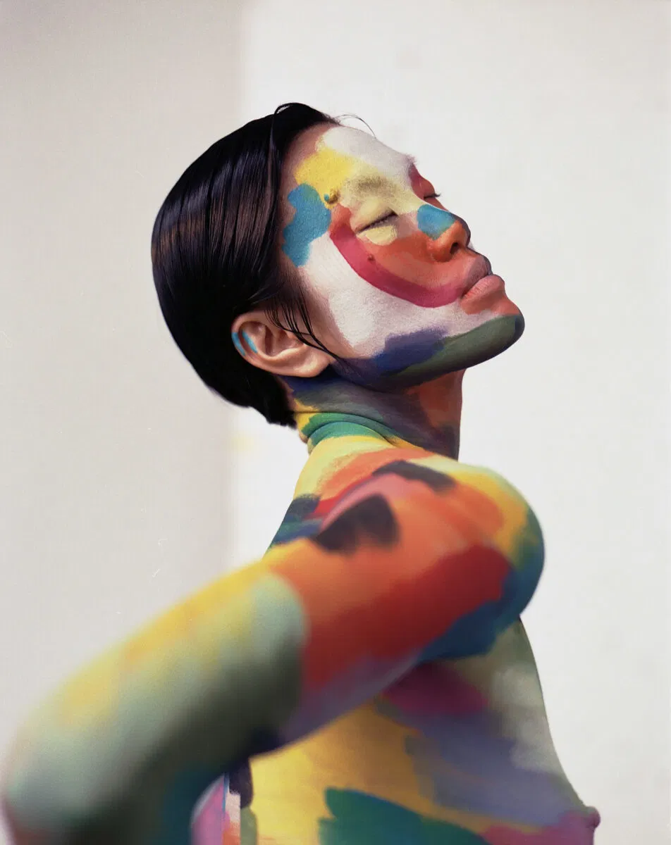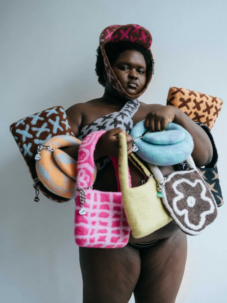 “Me encanta cómo la poderosa y fuerte mirada de Destiny adquiere un significado juguetón mientras sostiene todas estas coloridas bolsas que parecen caramelos. La luz natural, así como el fondo neutro, funcionan perfectamente para realzar la belleza del sujeto”. —Alessia Glaviano