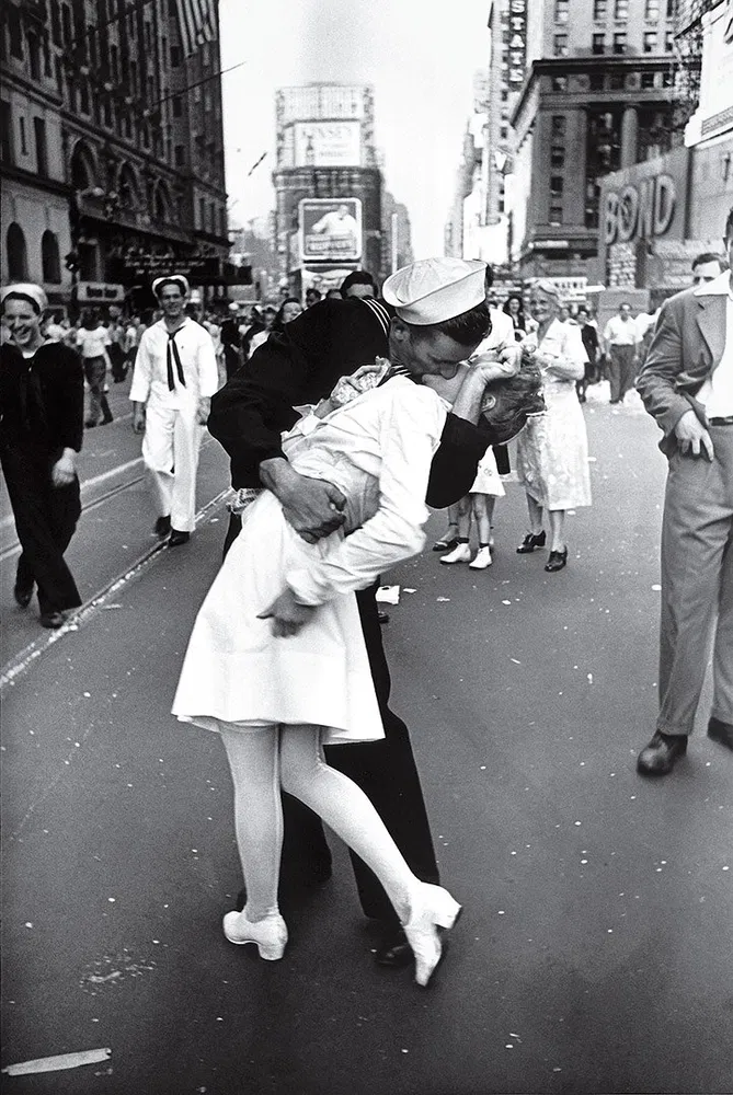 Quando la seconda guerra mondiale finì, il 14 agosto 1945, l'atmosfera per le strade di New York era euforica. Alfred Eisenstaedt si ritrovò presto a festeggiare con i festaioli a Times Square. Mentre cercava argomenti su cui concentrarsi, vide un marinaio afferrare un'infermiera, inclinarla all'indietro e baciarla. Sebbene ora alcuni sostengano che si tratti di un caso di cattiva condotta sessuale, l'immagine è diventata sinonimo di gioia sfrenata e passione spontanea. Nella memoria collettiva, rappresenta un momento trasformativo di speranza nella storia del mondo.