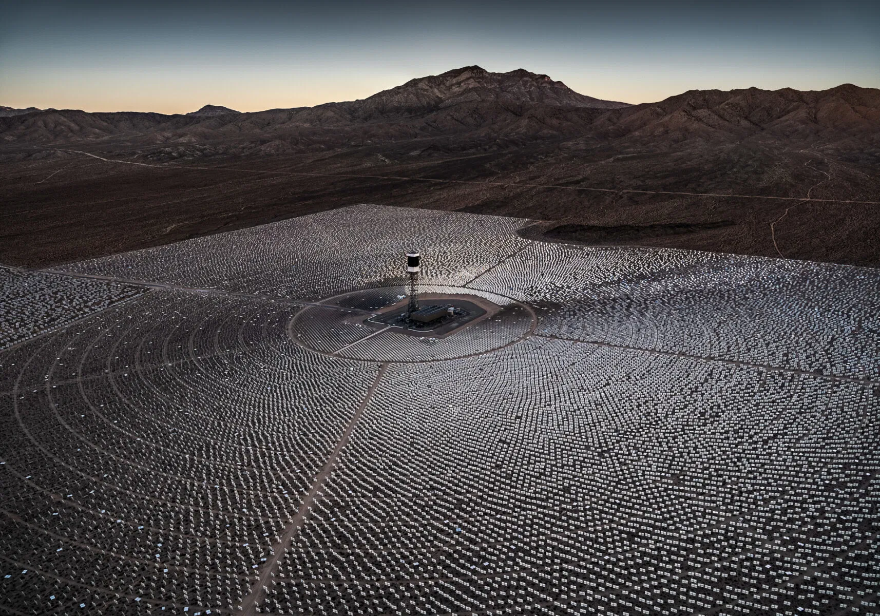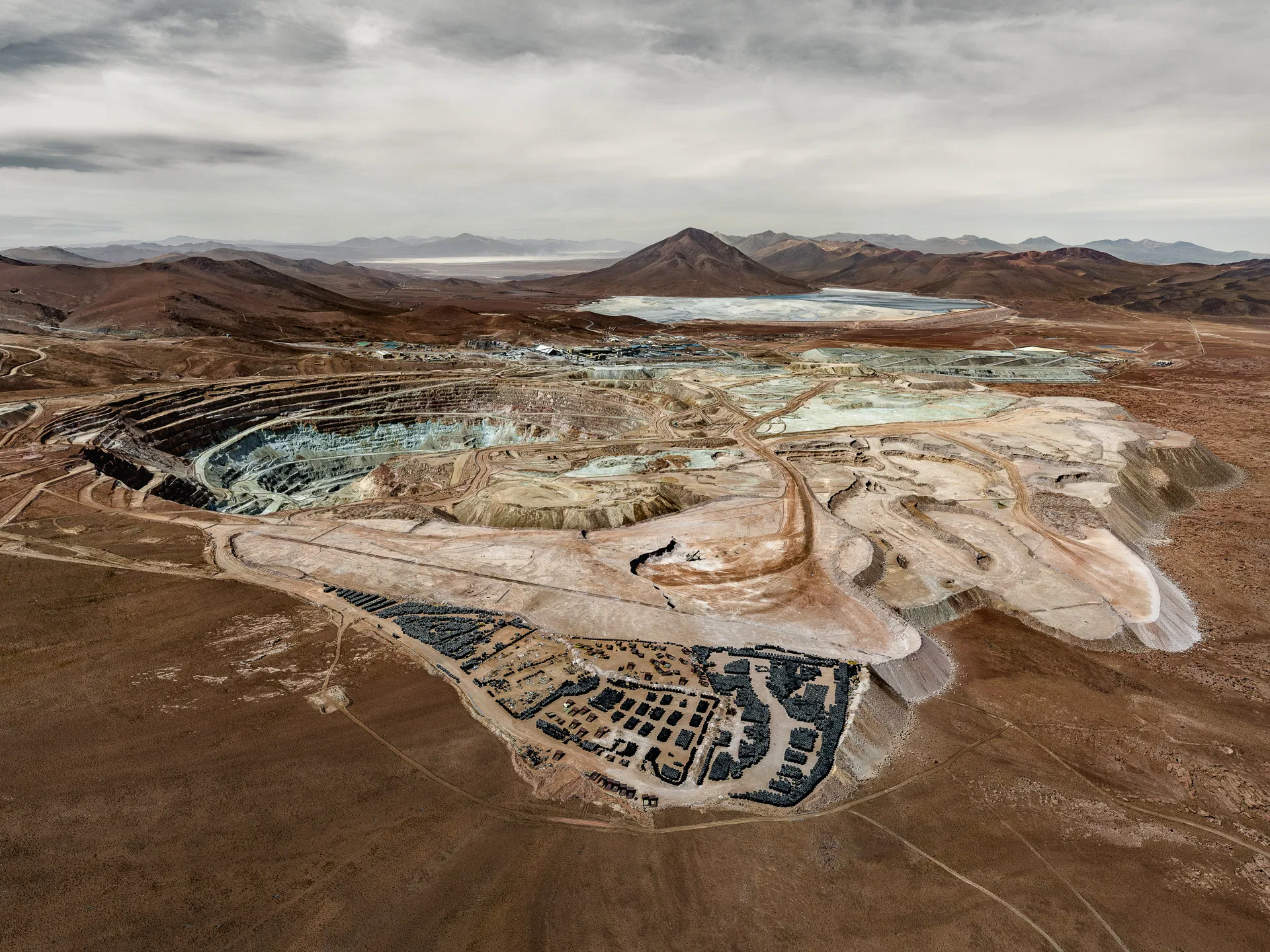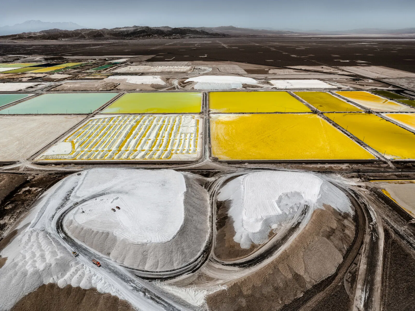 Dall'alto, questi siti assumono una bellezza strana e paradossale: la distesa a specchio della centrale solare Ivanpah, che luccica contro l'arido terreno del deserto del Mojave in California; gli stagni di evaporazione turchesi del deserto di Atacama in Cile, che brillano di litio concentrato; il terreno fratturato e color ruggine della miniera di rame Ray in Arizona; e le radure sbiancate dei siti di estrazione del nichel in Indonesia, dove la deforestazione avanza sempre più. Ogni immagine racconta una storia di progresso intrecciata con l'esaurimento.
