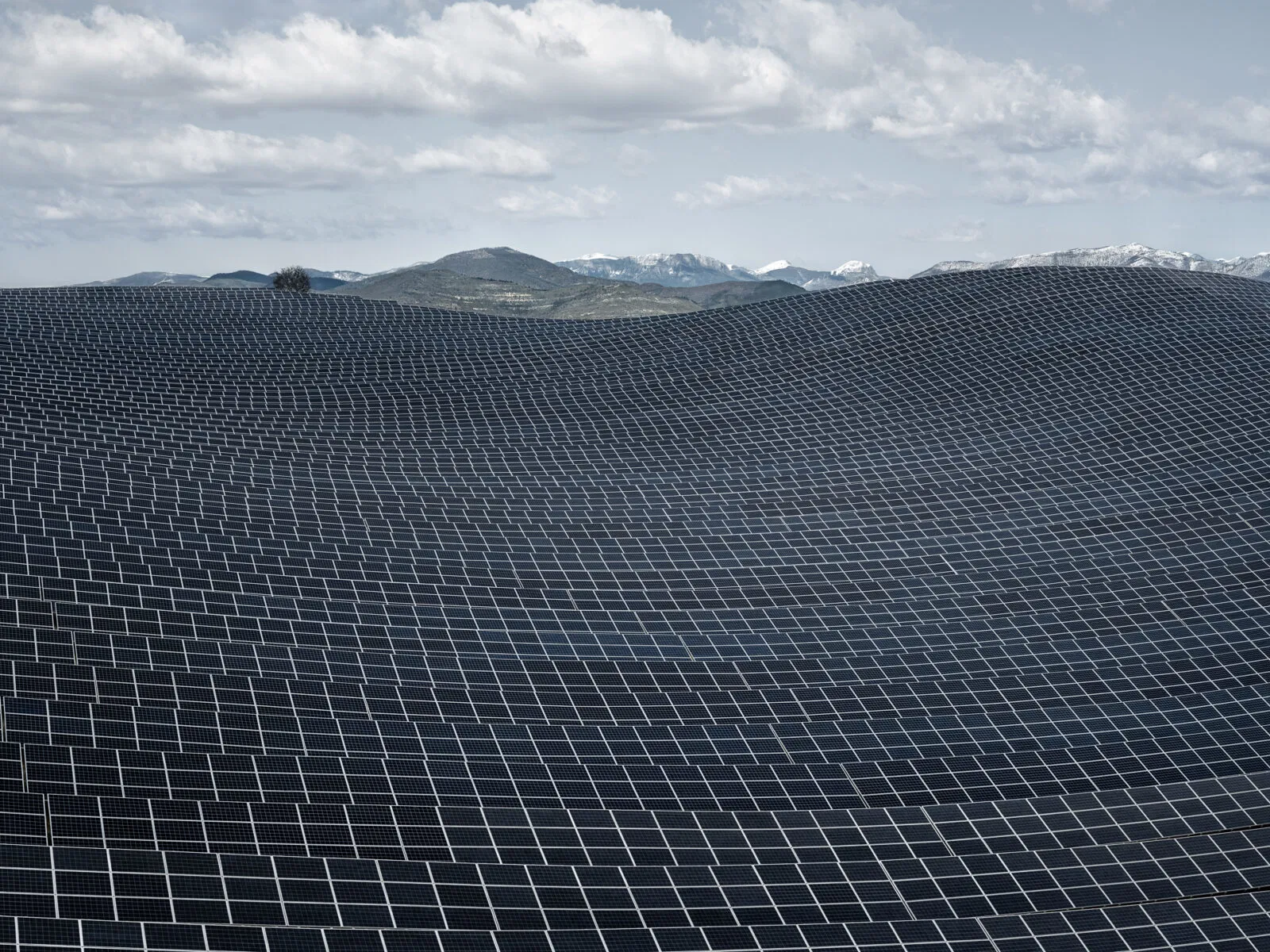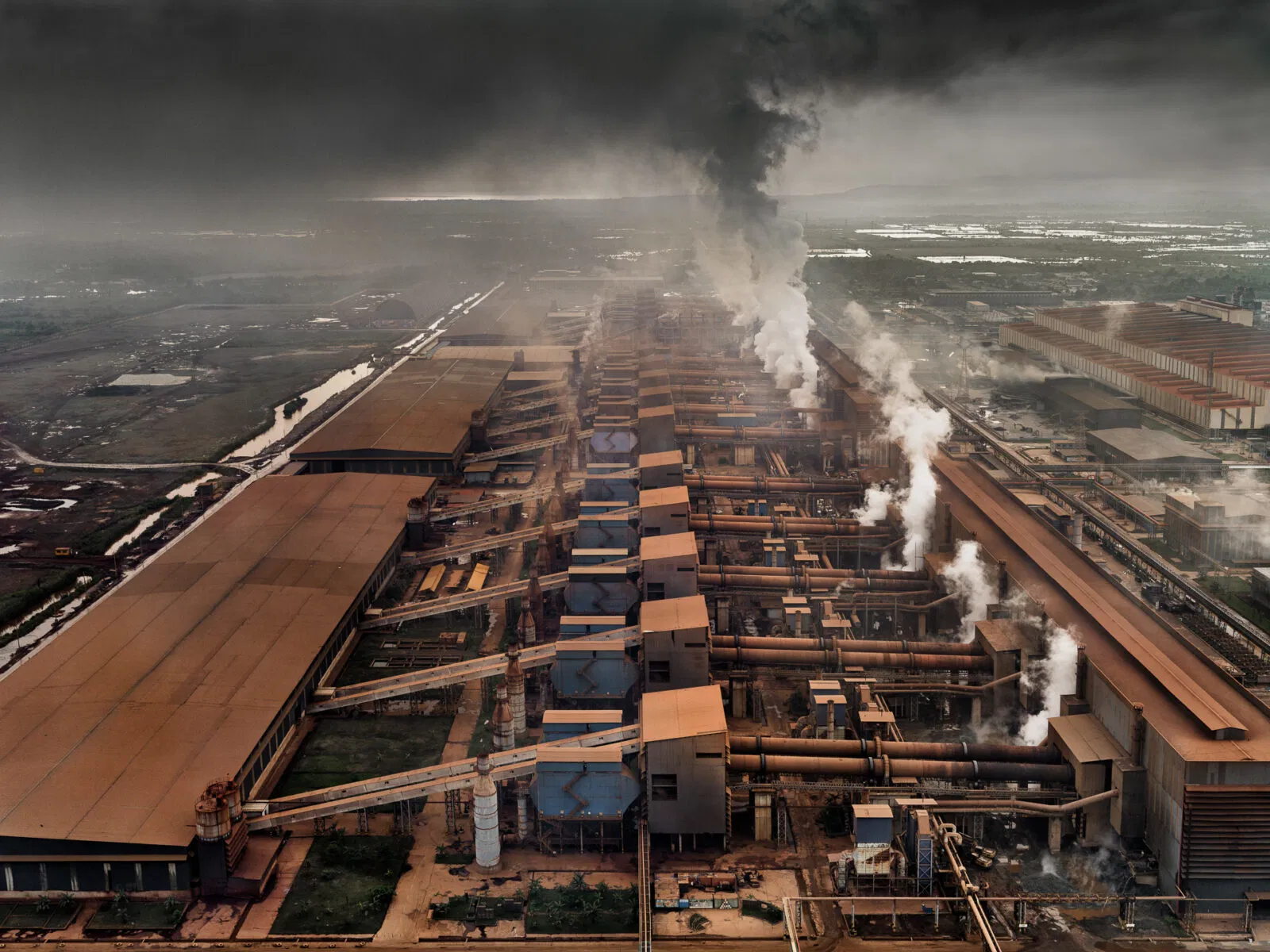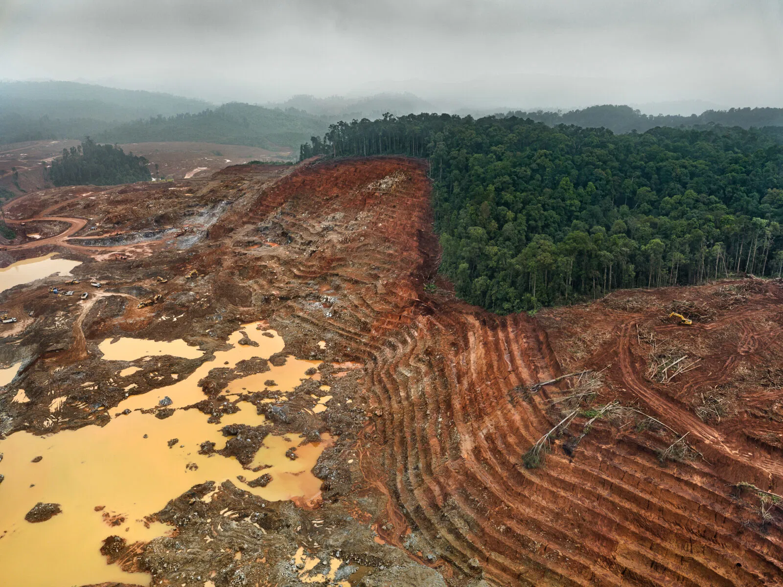 Dall'alto, questi siti assumono una bellezza strana e paradossale: la distesa a specchio della centrale solare Ivanpah, che luccica contro l'arido terreno del deserto del Mojave in California; gli stagni di evaporazione turchesi del deserto di Atacama in Cile, che brillano di litio concentrato; il terreno fratturato e color ruggine della miniera di rame Ray in Arizona; e le radure sbiancate dei siti di estrazione del nichel in Indonesia, dove la deforestazione avanza sempre più. Ogni immagine racconta una storia di progresso intrecciata con l'esaurimento.