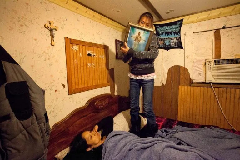 Creating transient bonds with the people that allowed her into their homes, she built a photographic exploration of small-town family life which resulted in her project Ou Menya (Ou menya: ‘With me’, or ‘At my place’ which in Russian can also denote possession, ‘it’s mine’) and subsequent associate membership at Magnum Photos.