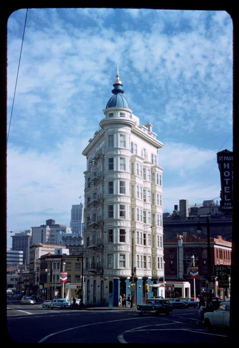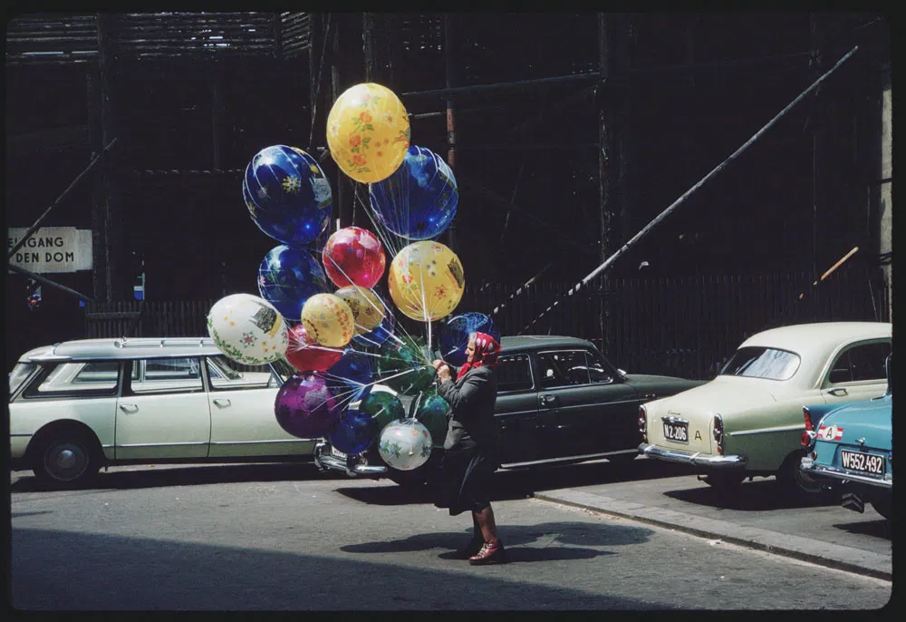 He took his first color image—a red Ford coupe with the silhouette of his wife Jean in the passenger seat, the Golden Gate Bridge in the distance—just two years after Kodachrome’s invention in 1938. For the next three decades, he harnessed its chromatic beauty to capture his surroundings with a Contax IIA 35mm camera. His images document everyday scenes, whether in Chicago, where he lived for many years, in San Francisco where he later relocated, or during his extensive travels across the U.S. and abroad.