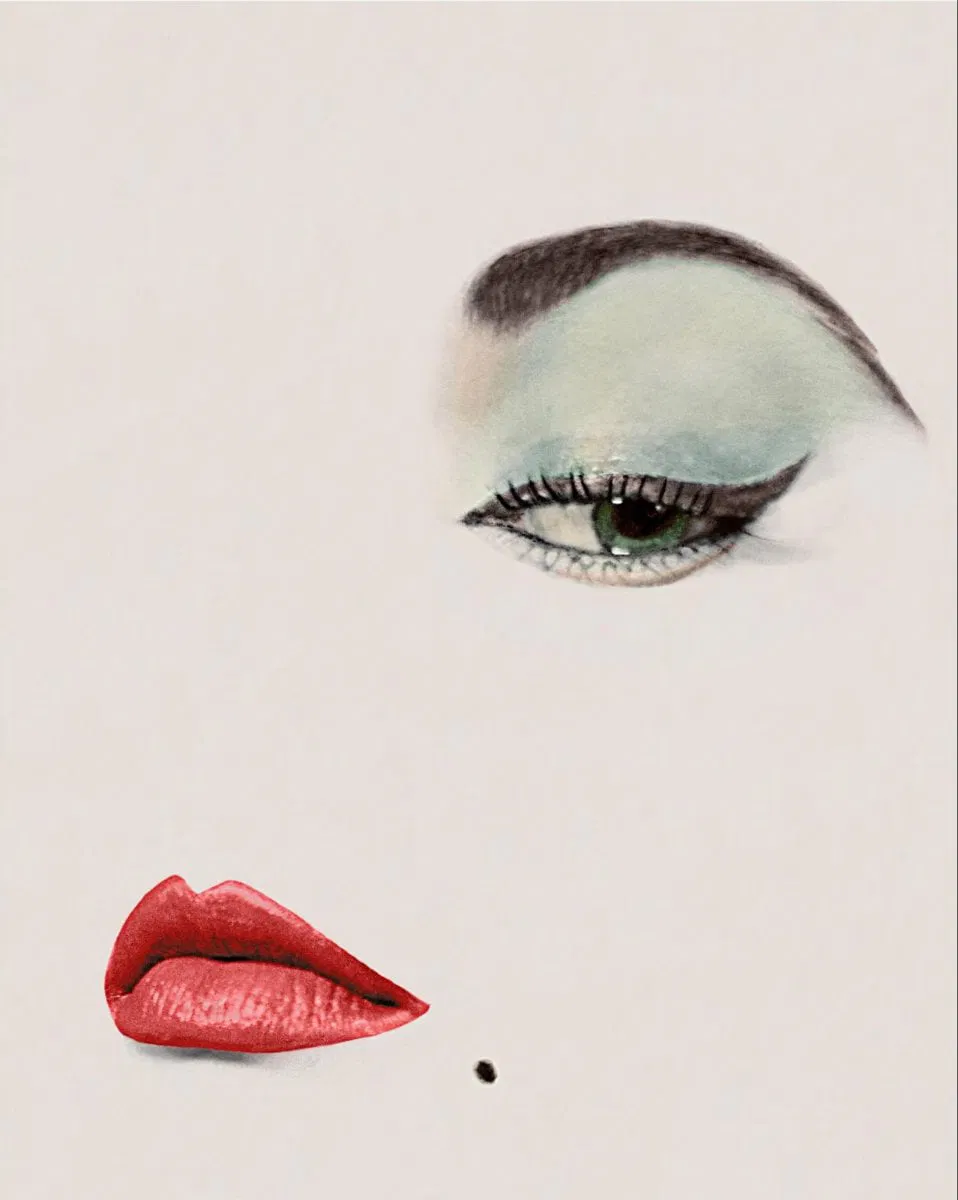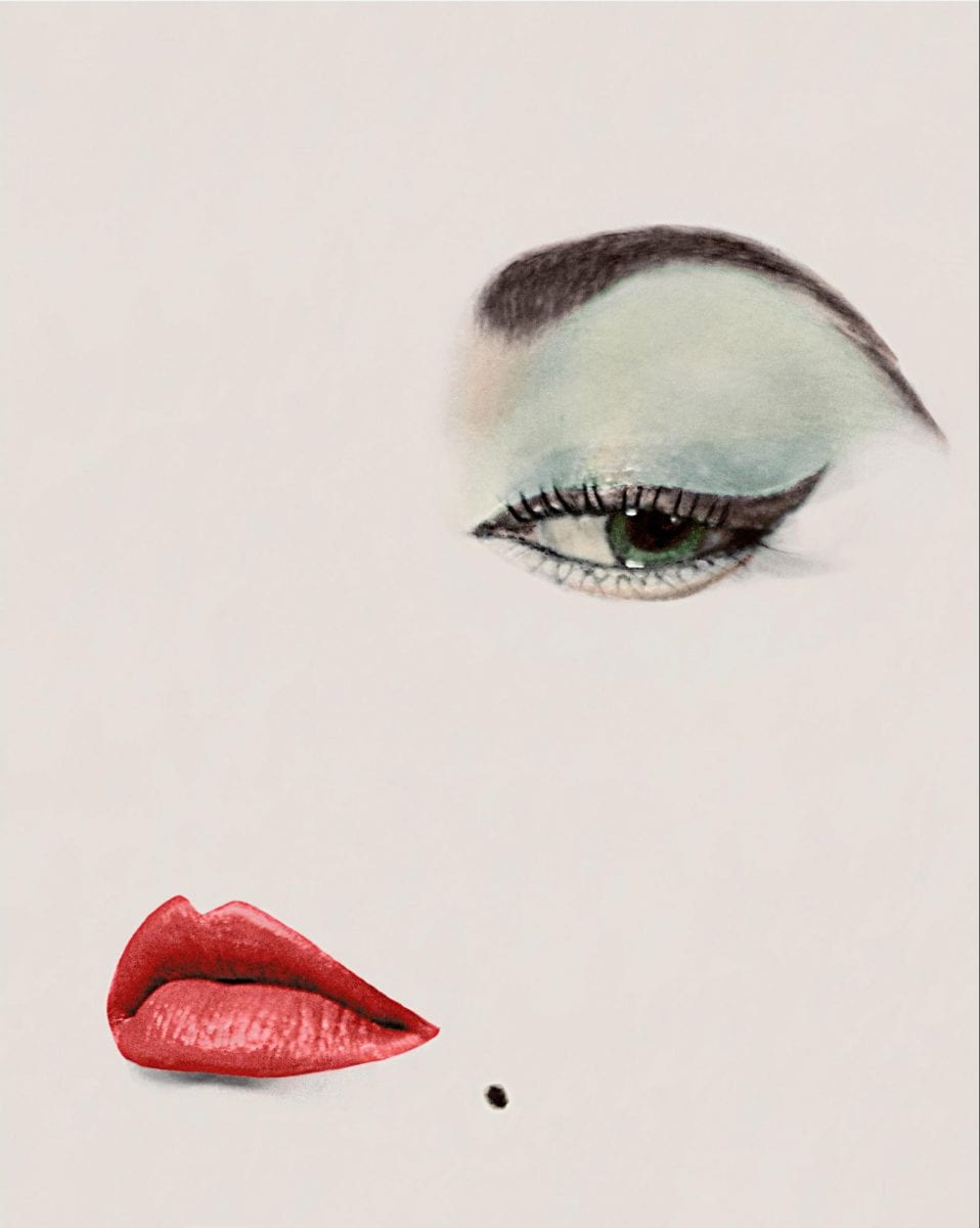 Using the techniques of photoengraving and colorization from the original Black and White negative, Erwin Blumenfeld created one of his most intriguing and dramatic covers for Vogue, one which has been endlessly imitated. The model, Jean Patchett, was reduced to a flat white background with perfect lips and a beauty spot. Blumenfeld had started working in Black and White photography but transitioned to color when he began working in the fashion photography industry, developing his style with techniques borrowed from his training as a painter. Blumenfeld currently holds the record for most Vogue cover shots and is a true fashion icon himself.