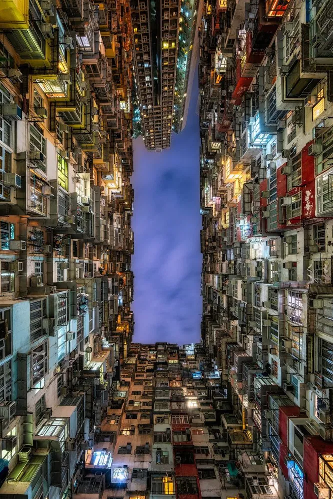 Many of the city’s residents live in small, tightly packed apartments within towering skyscrapers, which are themselves clustered closely together. Their facades, often in pastel hues, create captivating maze-like patterns that have long proved a compelling subject for photographers. One example is the Philippines-based John Kimwell Laluma, who captures this striking image of the Yick Cheong Building – also known as “The Monster”- shooting from below to emphasize the scale and density of the structure, a powerful embodiment of the city’s intense urban landscape.