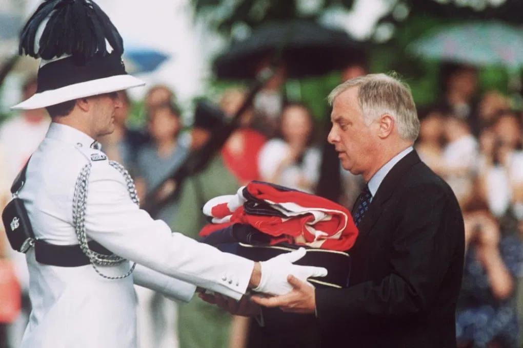 This image captures a defining moment of the 1997 handover ceremony: Christopher Francis Patten, Hong Kong’s last Governor, receiving the Union Jack that had flown over the territory for more than 150 years. It marked the culmination of a 13-year transition set in motion by the Sino-British Joint Declaration, signed in December 1984, and signified Hong Kong’s official return to China as a Special Administrative Region (HKSAR), ending 156 years of British rule.