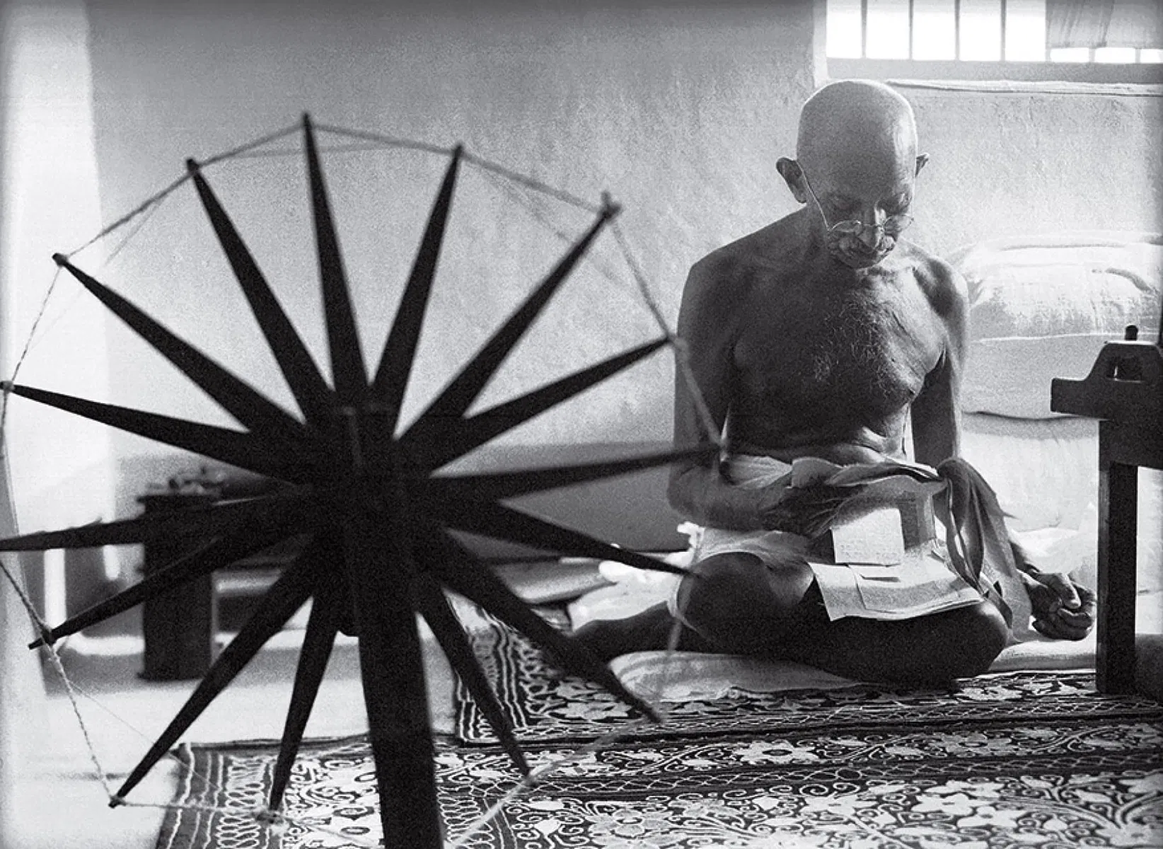 Whilst Gandhi was being held as a prisoner at Yeravda prison in Pune, from 1932 to 1933, the nationalist leader would encourage his countrymen to make their own homespun cloth instead of buying British goods. Margaret Bourke-White, who had been assigned to photograph Gandhi’s compound for an article on India’s leaders, had to learn how to spin a charkha before being allowed to sit with Gandhi to record his portrait. Her photo of Gandhi reading the newspaper alongside his spinning wheel posthumously became a symbol of Gandhi’s peaceful nature- a civil-disobedience crusader with a pacifist message.