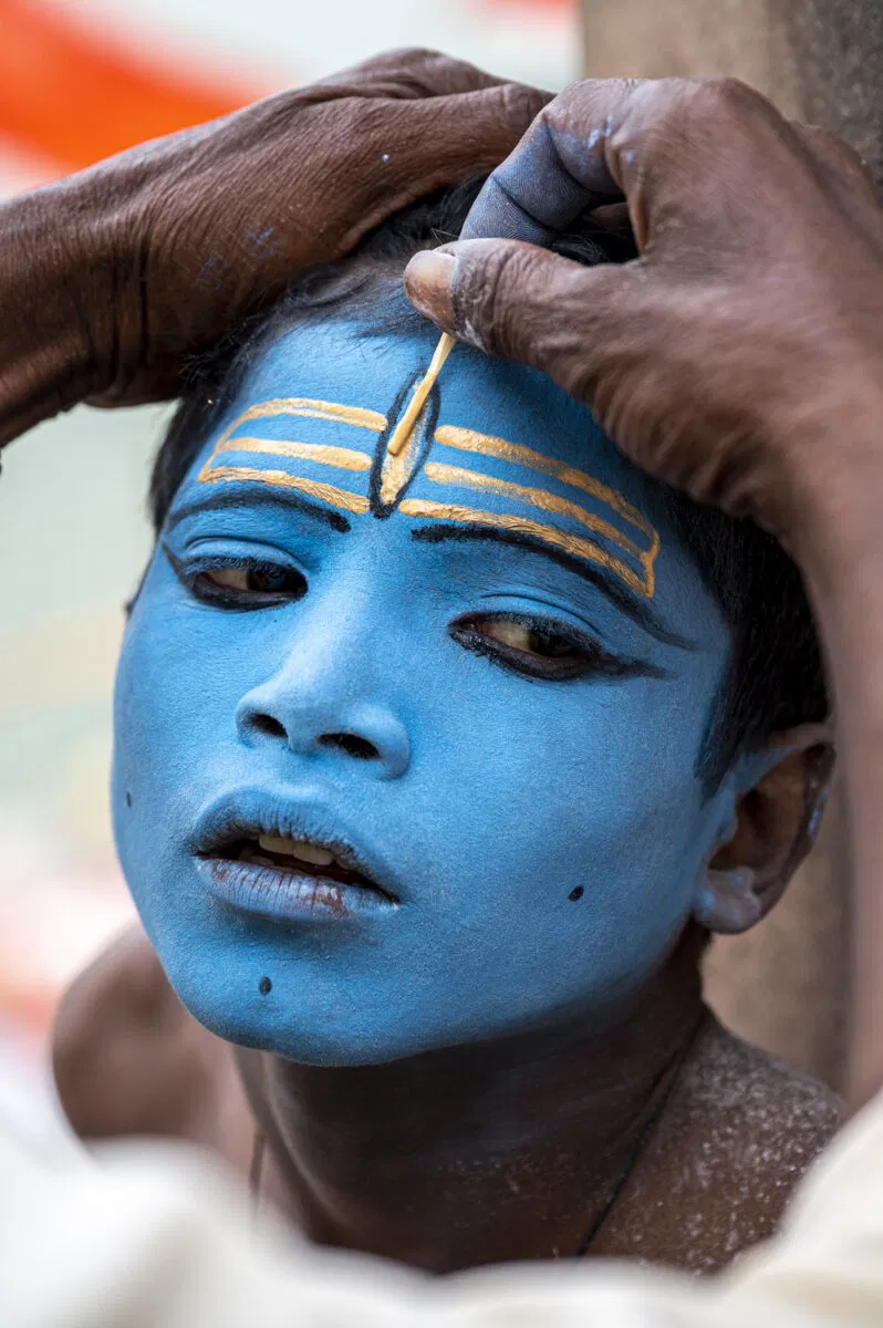 It’s not uncommon here for impoverished children to dress up as deities to seek alms. This photograph, captured from close quarters, effectively conveys the melancholy in the child’s eyes and, combined with the striking blue makeup, creates a sad yet beautiful image that speaks to the poverty which plagues to many in India.