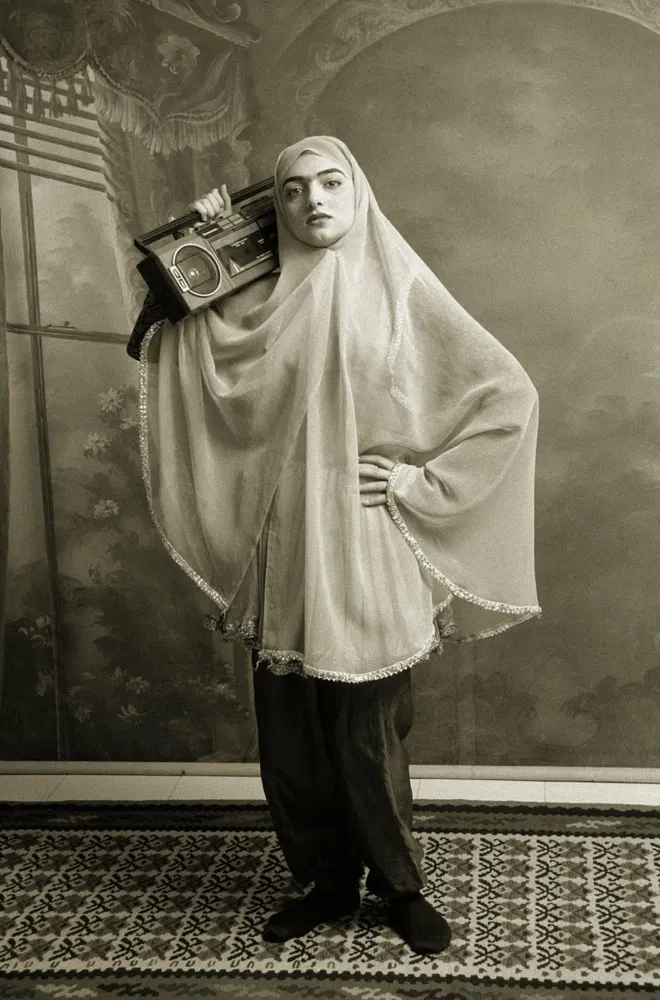 The stylization and sepia tones of the staged portraits are almost identical to the classic photos of the day but are supplemented by references to the present day. In perhaps the most famous of the series, a veiled woman holds a boombox on her shoulder, questioning how times have changed, the roles of women in society and whether much has changed for women or not.