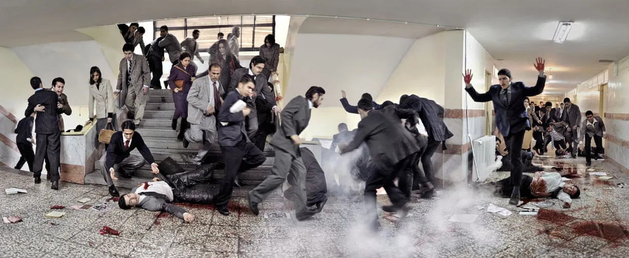 This panoramic tableau depicts the murder of Azar Shariat Razavi, Ahmad Ghandchi, and Mostafa Bozorgnia, three students murdered by police during student demonstrations against the visit of Richard Nixon in 1953. Akhlaghi freeze-frames staff and students as they run panic-stricken, down steps while bloodstained bodies lie in corridors surrounded by distraught friends. Iran still remembers the tragedy every year, on Student Day.