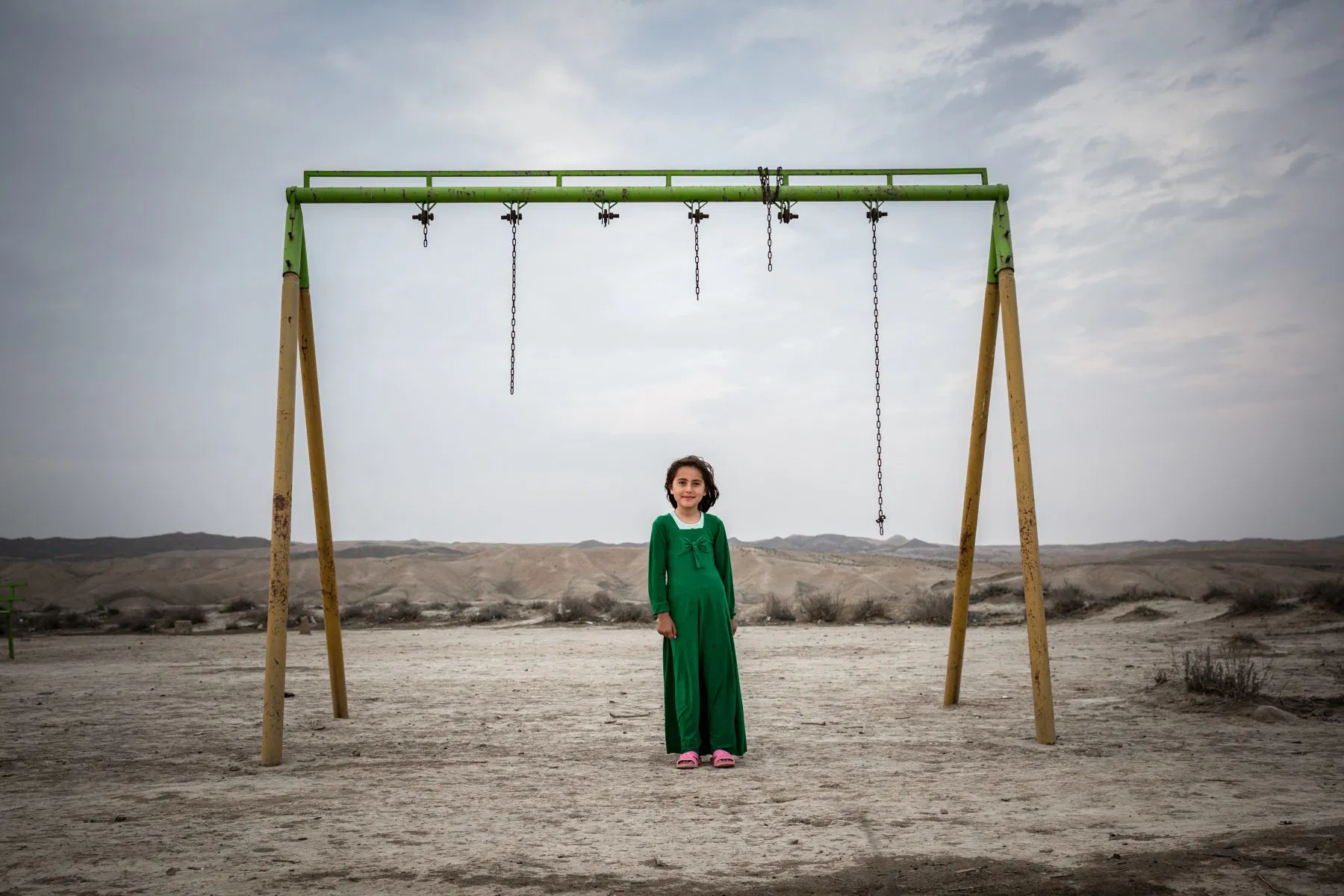 The young girl’s smiling face, set against the backdrop of broken swings and the rugged, arid landscape, creates a surreal image that is both heartwarming and melancholic, capturing the resilience and joy of children in the face of challenging circumstances