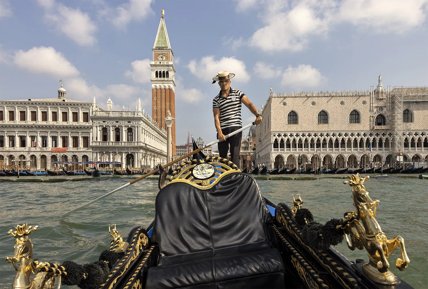 The photograph captures Vignotto’s pride as he stands aboard his boat wearing a traditional canotier hat, set against the iconic Venetian cityscape. A captivating image that is distinctly Venetian and a potent symbol of Italy’s rich cultural heritage.