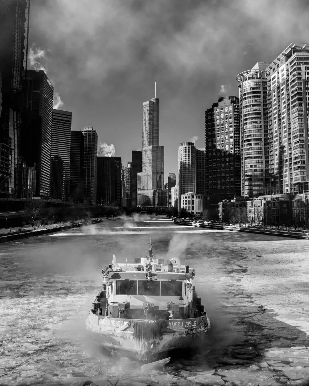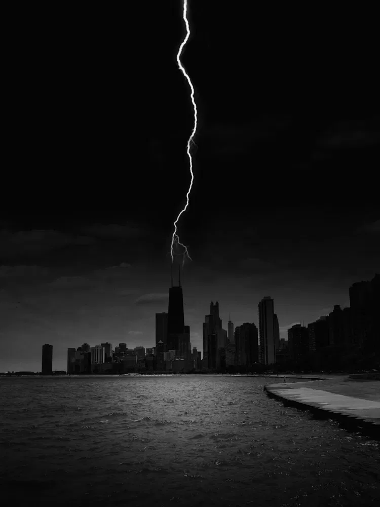 A single bolt of lightning slices down through the Chicago sky, striking the crown of a solitary tower with sharp, white intensity. The surrounding skyline sits in near-silhouette, the lake below shifting in muted grey. It’s a rare, charged moment — a collision of drama, scale, and contrast — and yet, through Peterson’s lens, the strike lands with such clarity and intent that it feels less like chance and more like a moment he was poised to catch.