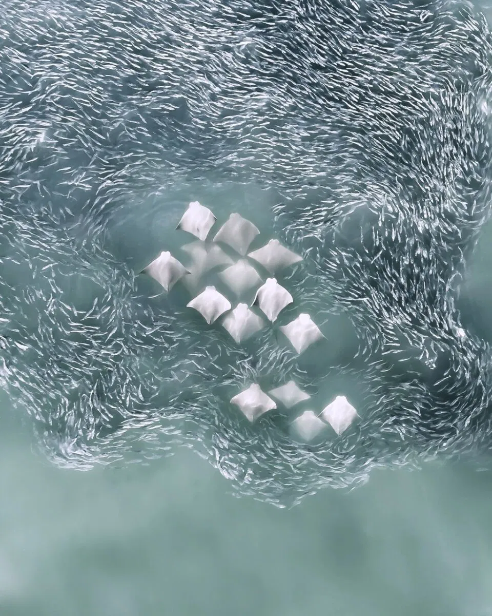 “Whales and sharks feeding on schools of fish are always a special sight, large fevers of cownose rays gliding in synchrony. I’ve watched humpback whales stop feeding to go play with a passing pod of dolphins. Each species is so important to the delicate balance of the sea. Hopefully, my imagery brings awareness and respect for our oceans. We are not alone, we share this planet, and 71% of it is Ocean!”