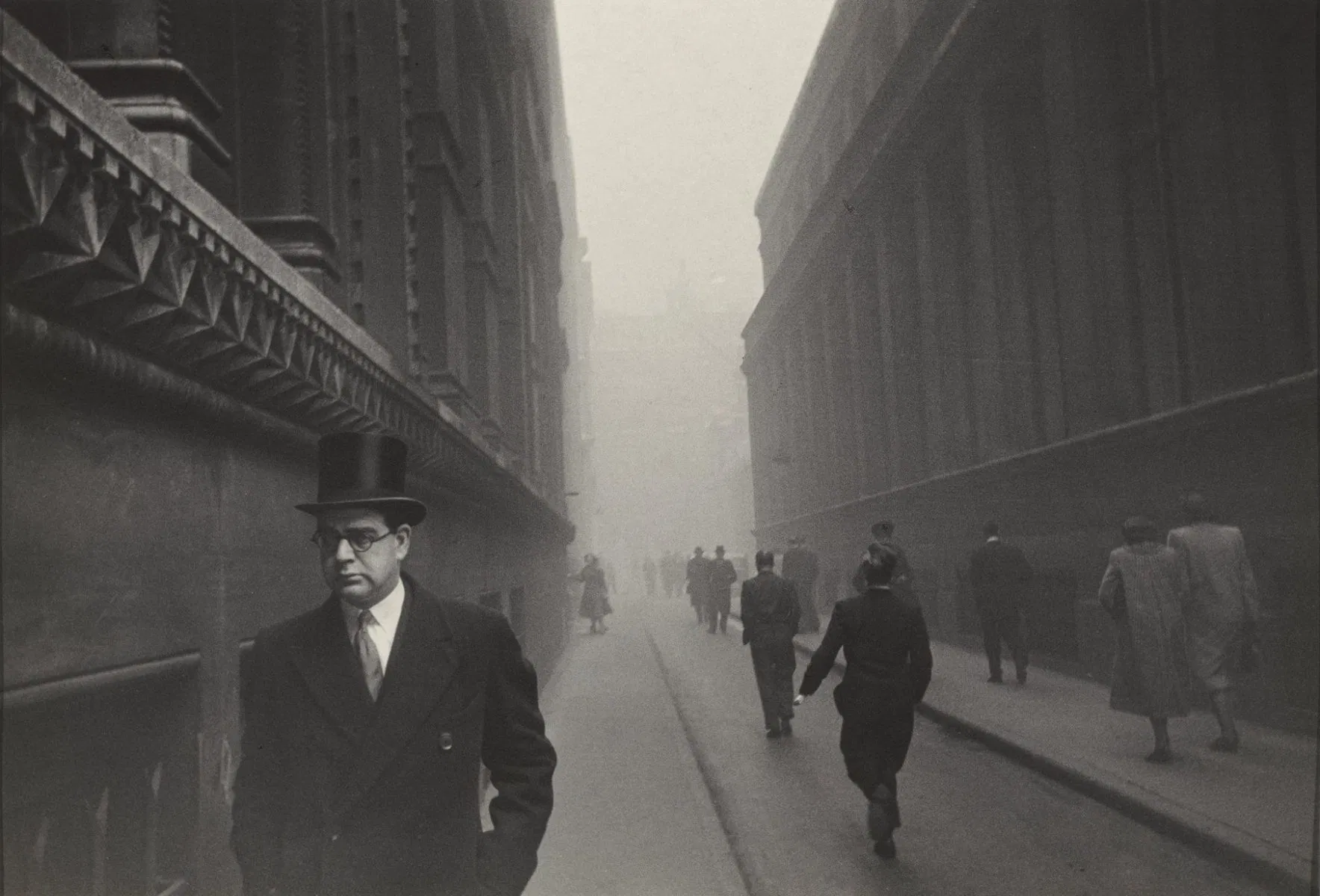 His depiction of suited traders, walking hurriedly beneath the shadowed profiles of monolithic buildings in London’s financial district, permeates with an edgy, cinematic intensity, which, along with the granular aesthetic, typifies the intuitive style for which he would later become renowned, following his defining 1959 series ‘The Americans’, which dramatically altered the course of documentary photography thereafter.