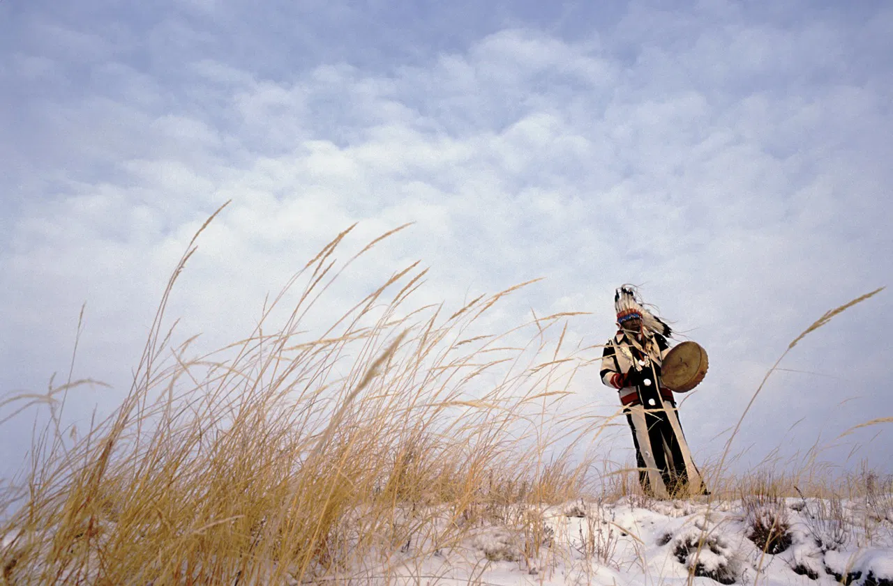 Above image: Chief Arvol Looking Horse stands over a field near the Moro River in Green Grass, S.D., beating a drum during his daily prayers to his Lakota ancestors. Green Grass is a tiny community with traditional roots on the Cheyenne River Reservation, where Lakota people live. The chief has that title because he has been the keeper of the Sacred White Buffalo Calf Pipe of the Lakota people since he was 12 years old.