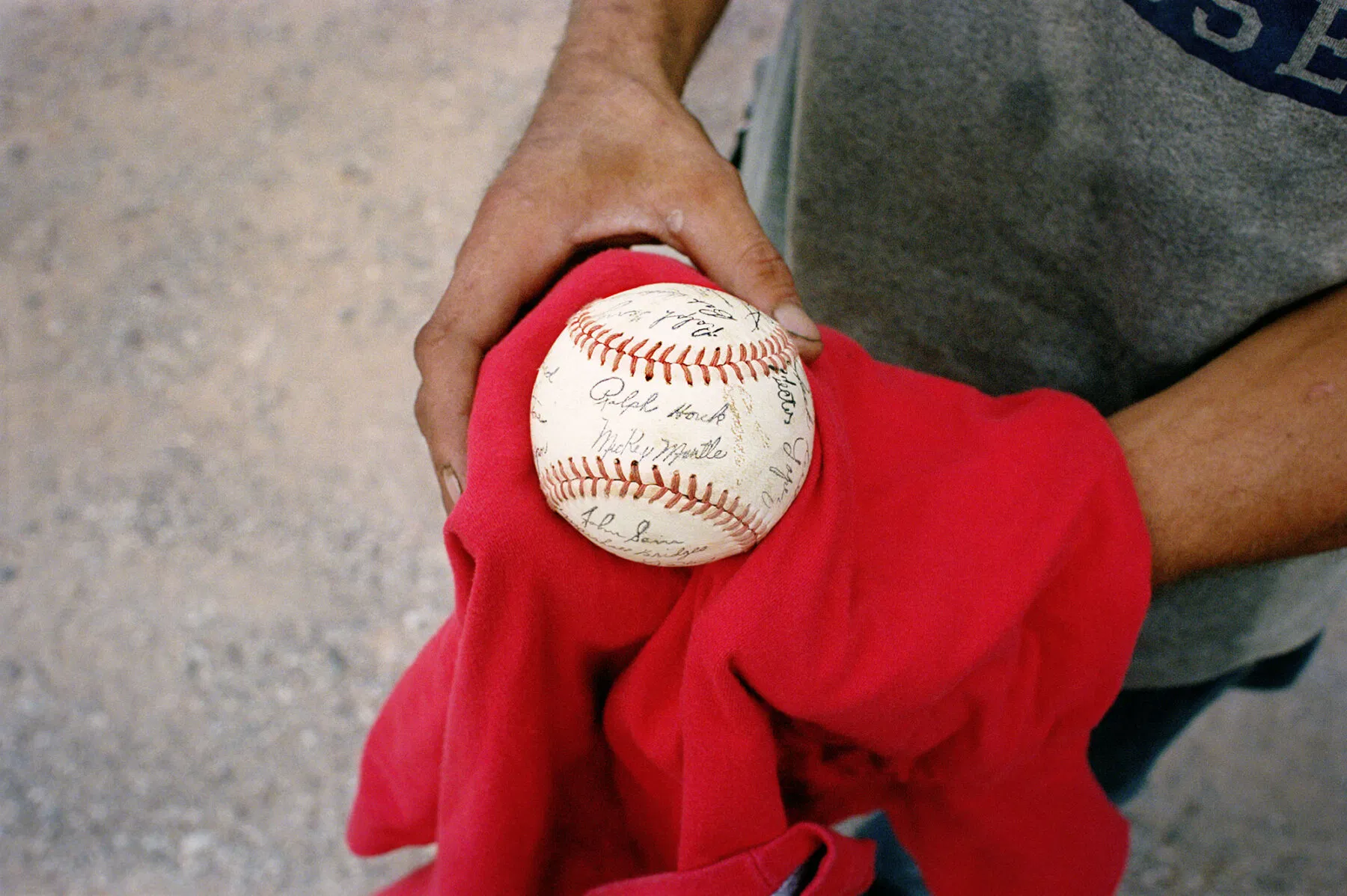 Photo of hands holding a baseball in a red cloth by Mike Brodie