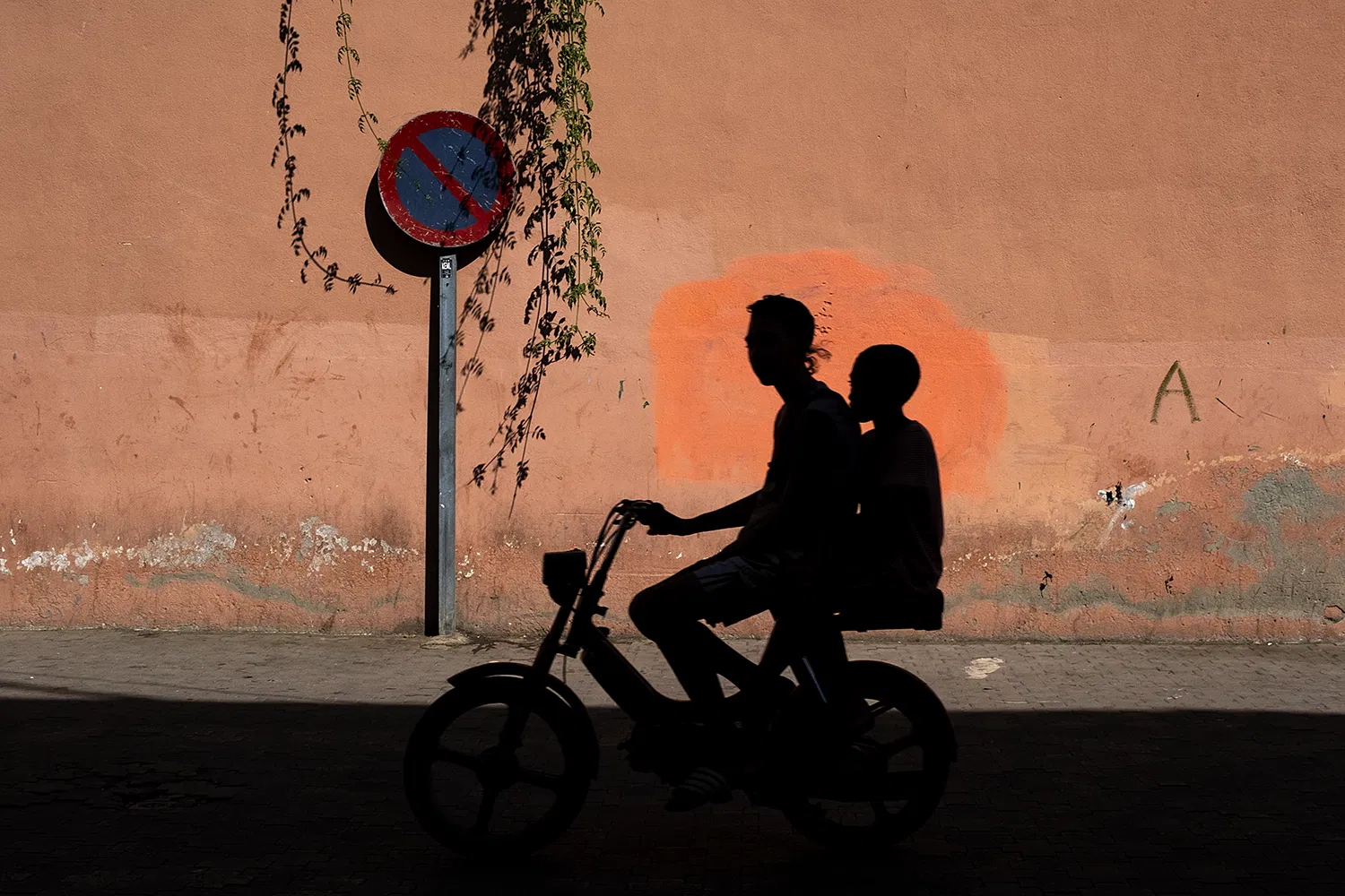 In this compelling photograph by Greek photographer Costas Delhas, two young men ride a motorcycle through the afternoon heat of the Moroccan capital. Against the backdrop of a pastel-orange wall, the composition is exquisite, their heads are artfully positioned within an almost circular shape, slightly distinct in shade, that almost resembles the sun. It captures perfectly the atmosphere of the scene and echoes the Morocco depicted by the great Harry Gruyaert. The play of light and shadow, coupled with the vibrant hues, a homage to the Magnum photographer’s masterful portrayals of the country.