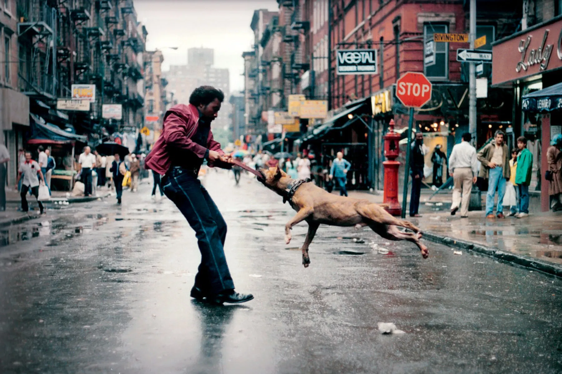 His 1980 image, Man and Dog, Lower East Side, is emblematic of this practice: vivid, direct, and rooted in everyday truth, a fleeting moment is frozen in the city’s chiaroscuro: a man leans into motion, his dog airborne in the jump, the wet pavement reflecting a patch of sky, the tenements of Orchard/Delancey framing them.