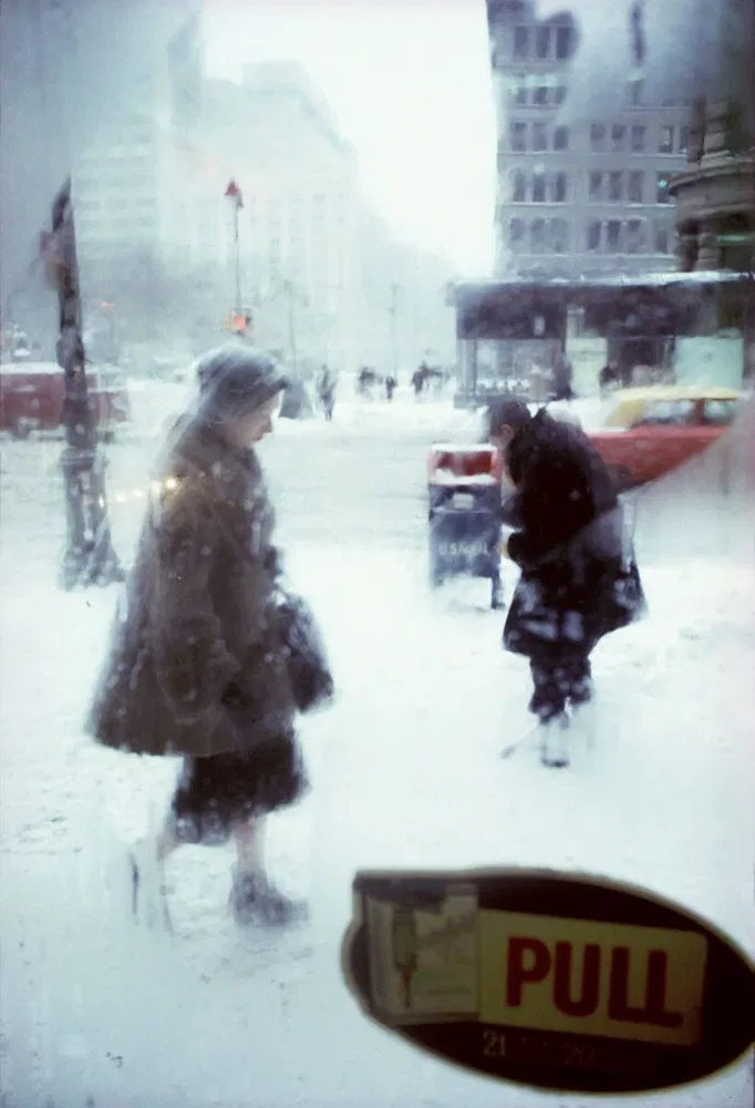 This image, though not among his best-known, captures this sensibility with characteristic subtlety. Shot through a window blurred by condensation and cold, two figures cross a snow-covered street as the city dissolves into mist and motion. What might have been mundane becomes quietly transcendent, an intimate moment suspended within the larger rhythm of New York, rendered with the sensitivity, color, and eye for composition that defined Leiter’s lifelong dialogue with his city.