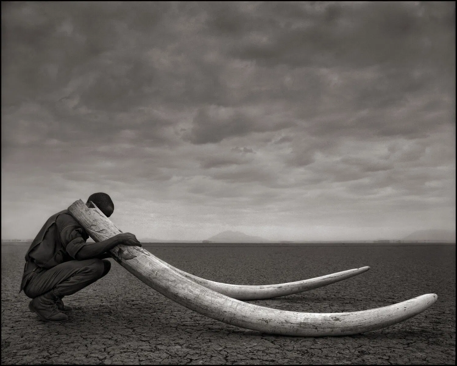 The monochrome tones, engender a dramatic and melancholic atmosphere which Brandt says, in addition to ‘stripping the image down to the essentials, thus forcing the viewer to focus on the graphic shapes and composition within the frame, is in keeping with the concept and subject matter’. Though photographed in East Africa, he asserts that it ‘could apply anywhere that animals used to roam’.