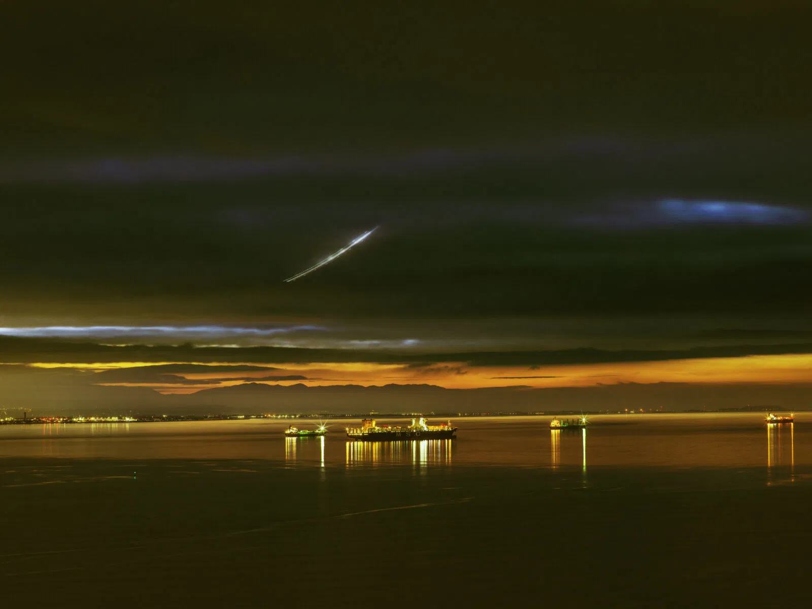 The images oscillate between the documentary and the meditative. At times, ships appear as stark silhouettes, their dark, angular forms set against glowing dawns or shrouded in the soft veil of mist. In one striking triptych that forms the book’s centerpiece, a massive container vessel—flanked by two smaller companions—slowly recedes into obscurity: from solid form in the first frame to a faint ghost by the third, nearly swallowed by the cloudy, grey winter morning. Elsewhere, ships gleam more vividly, their lights flickering like neon constellations across dark waters.