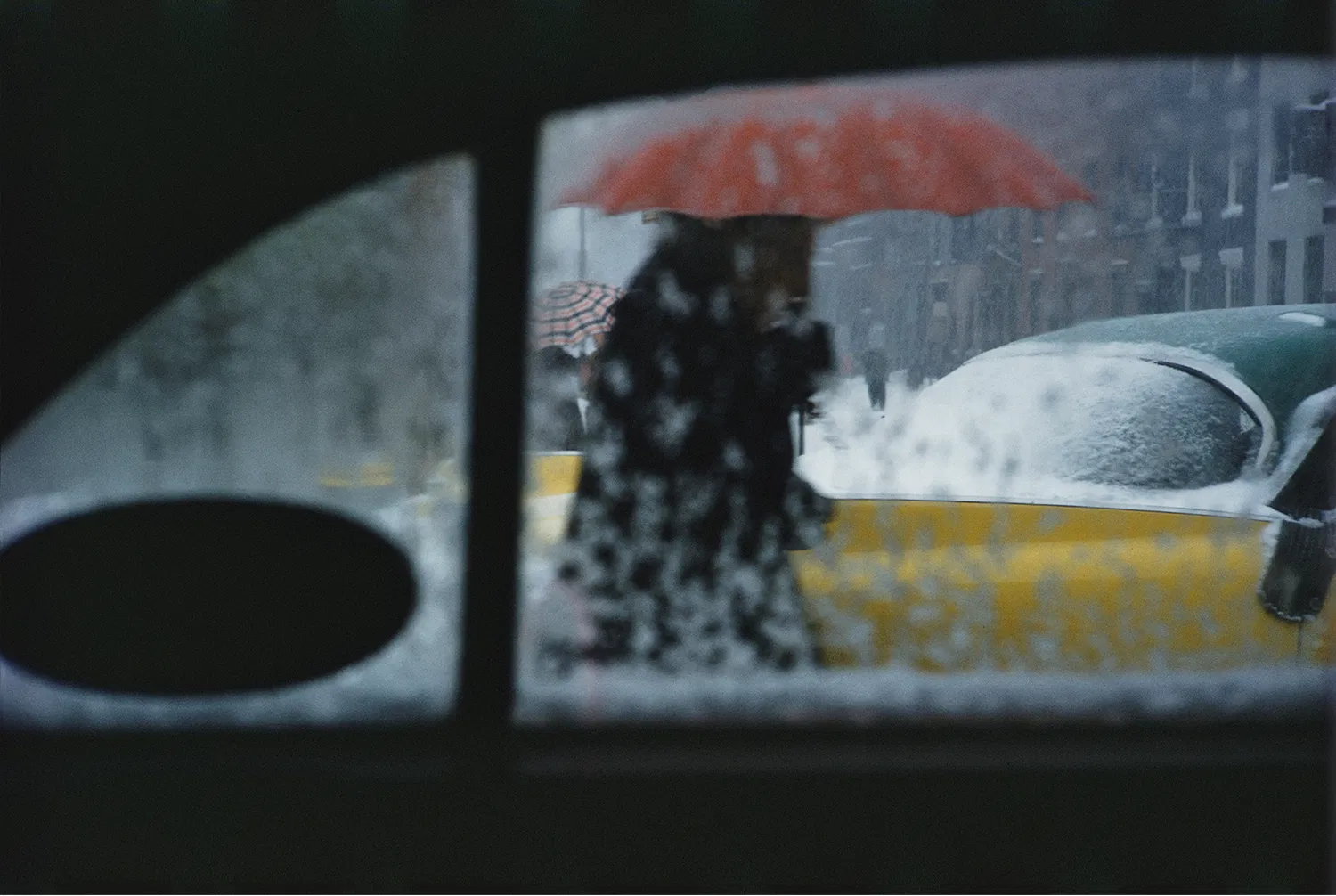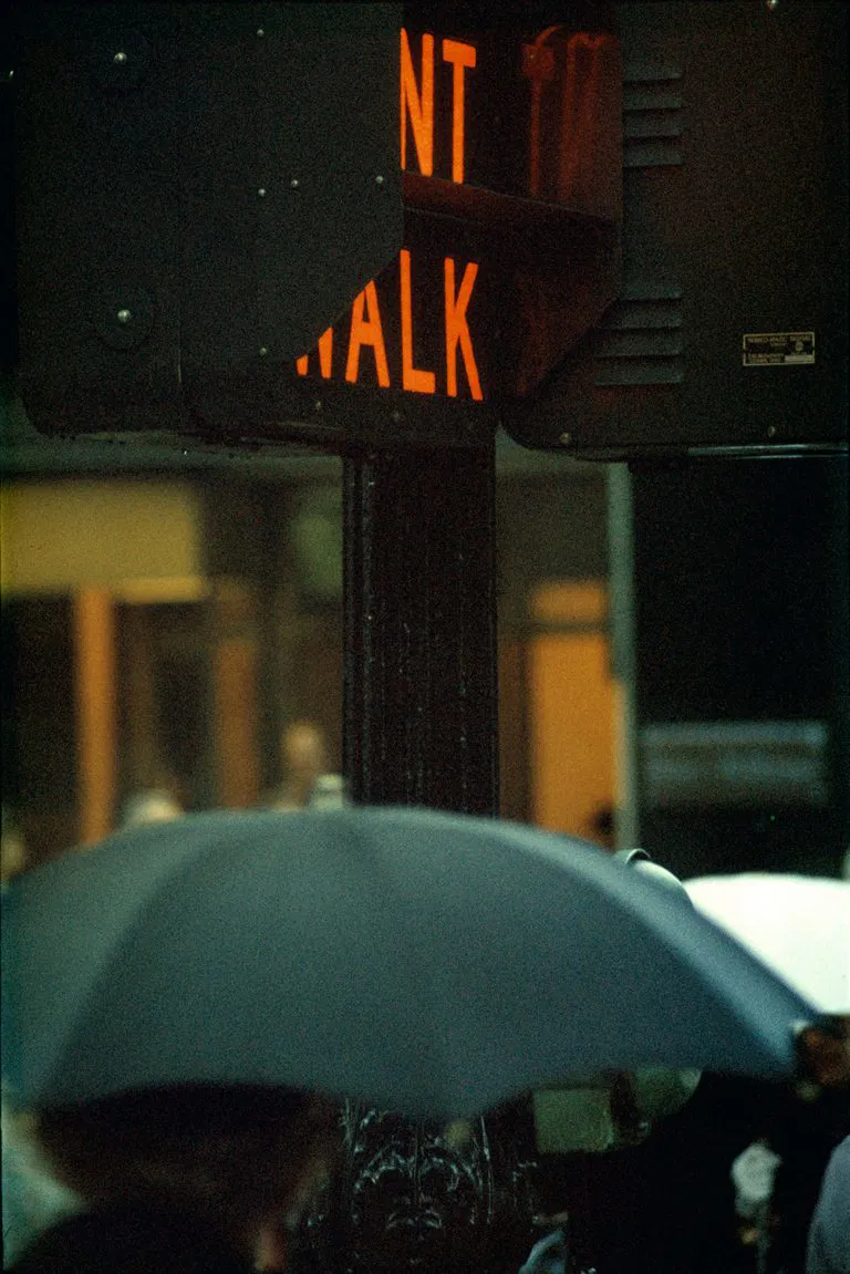 Human subjects are rarely the focal point; in fact, their faces are invariably obscured, whilst his frequent use of expired Kodachrome film gives splashes of color – provided by neon advertisements, umbrellas, or yellow taxis – a muted, almost pastel-like tone, at times making the images appear more akin to a painting than a photograph.