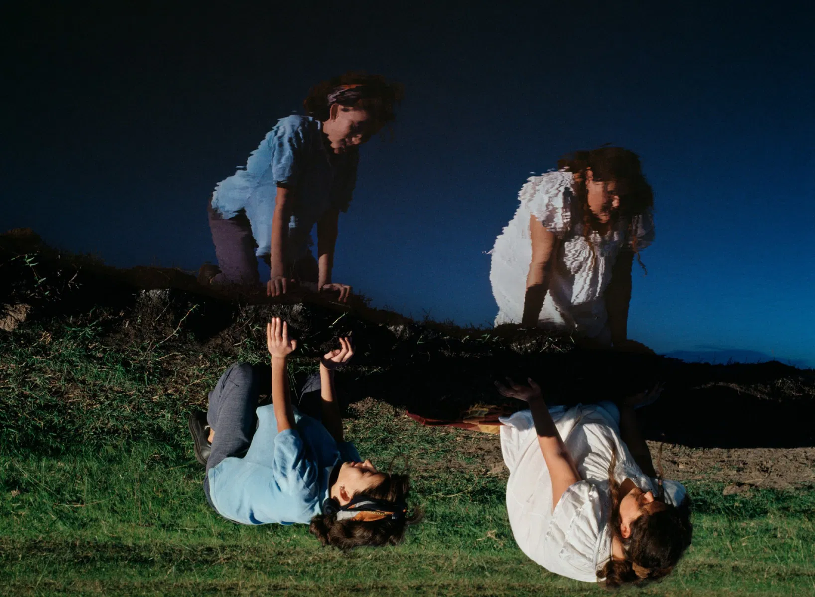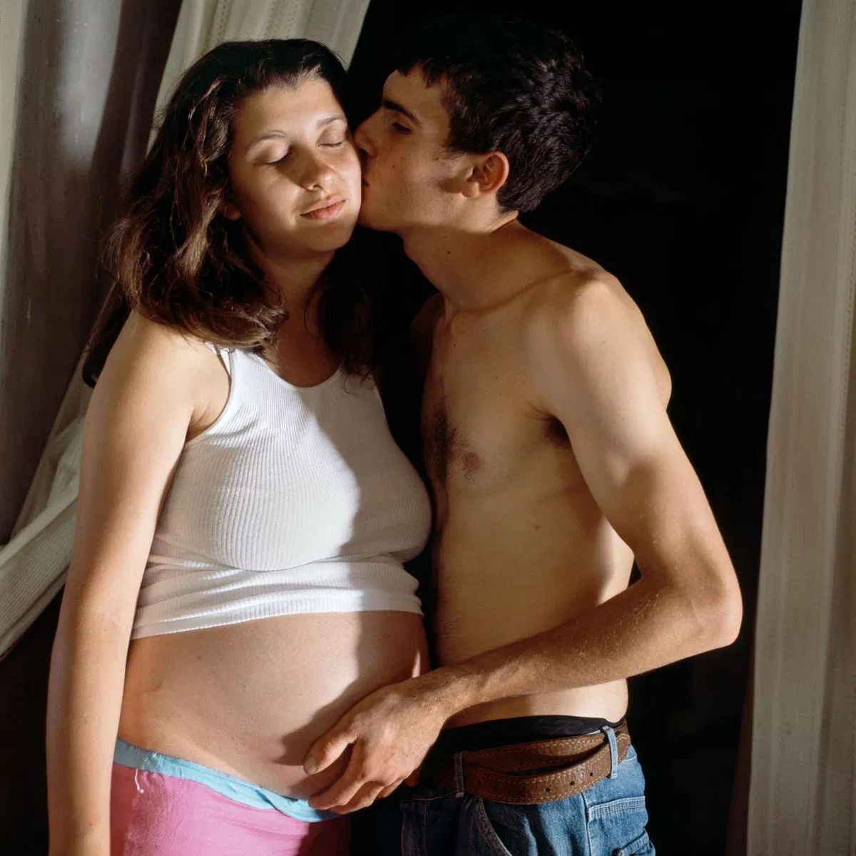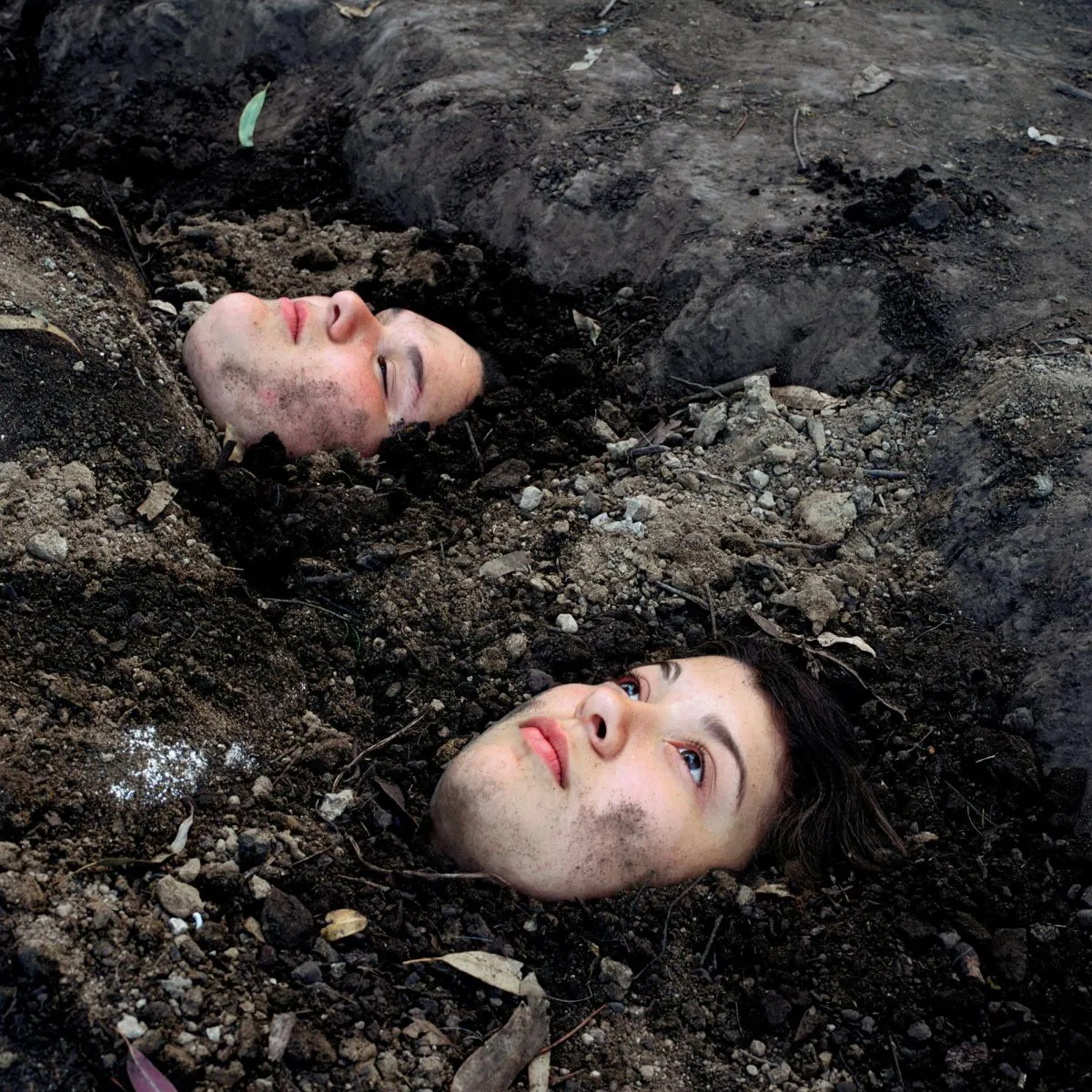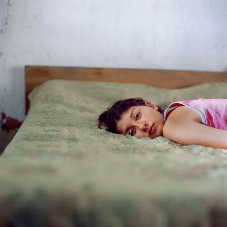 This sincere, spontaneous collaboration infuses the work with some dreaminess that doesn’t prevent their social context to emerge. We witness two teenagers losing the freedom of childhood, with many photographs working as metaphors for this passage: horses are a recurring theme, though always trapped in a poster; one photograph shows Belinda walking down the dirt road, her hands filled with blood; another captures them buried, with only her faces uncovered.