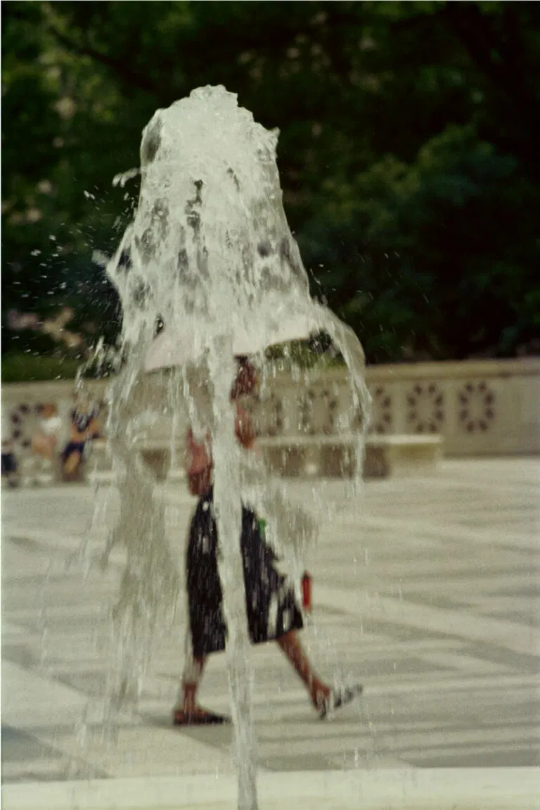 His compositions at times, verge on the abstract, owing to his employment of unique techniques and perspectives, such as photographing through windows, their surfaces filtered by rain, steam, or faint reflections, and utilizing shadows, unusual angles, and frequently, a telephoto lens, to achieve compression, in contrast to the wide-angle style commonly used by street photographers.