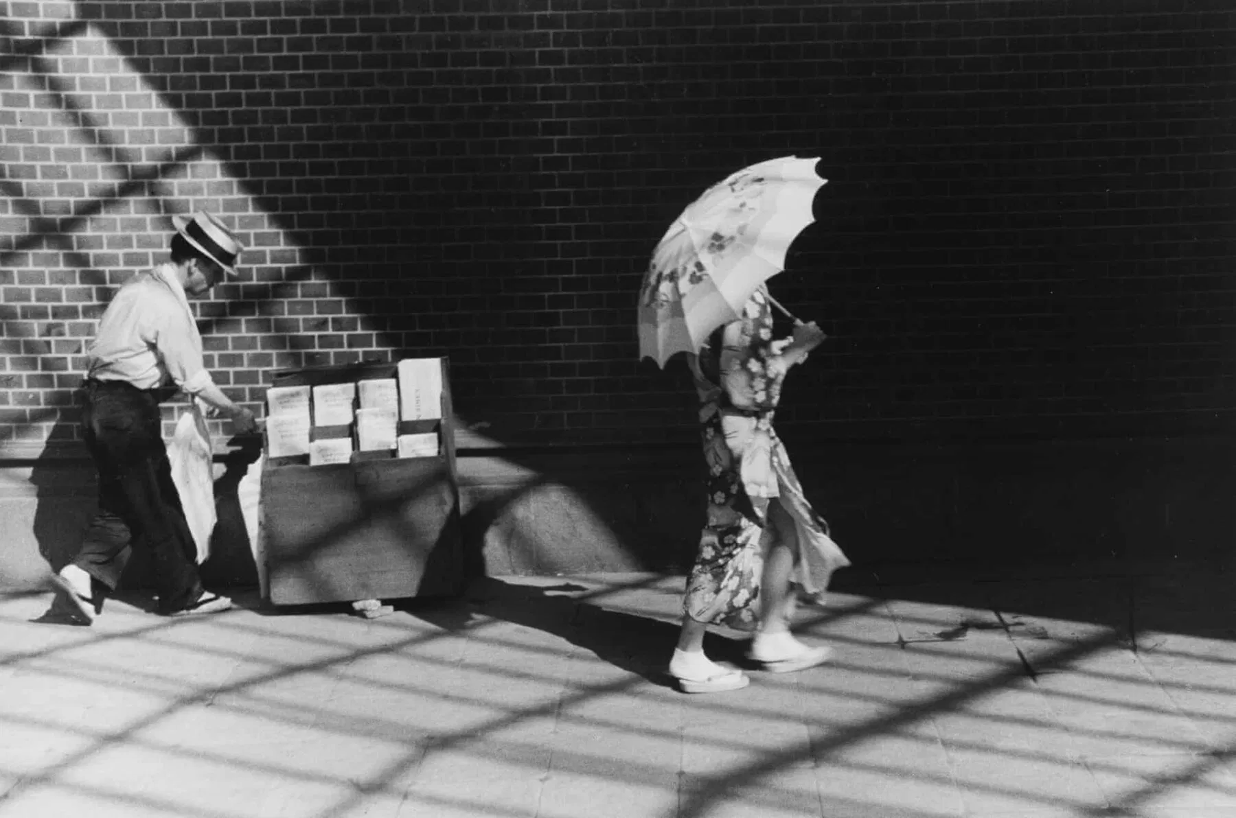 4. Kineo Kuwabara – A girl with an umbrella passing a newspaper vendor, Yarakucho, Tokyo, 1936