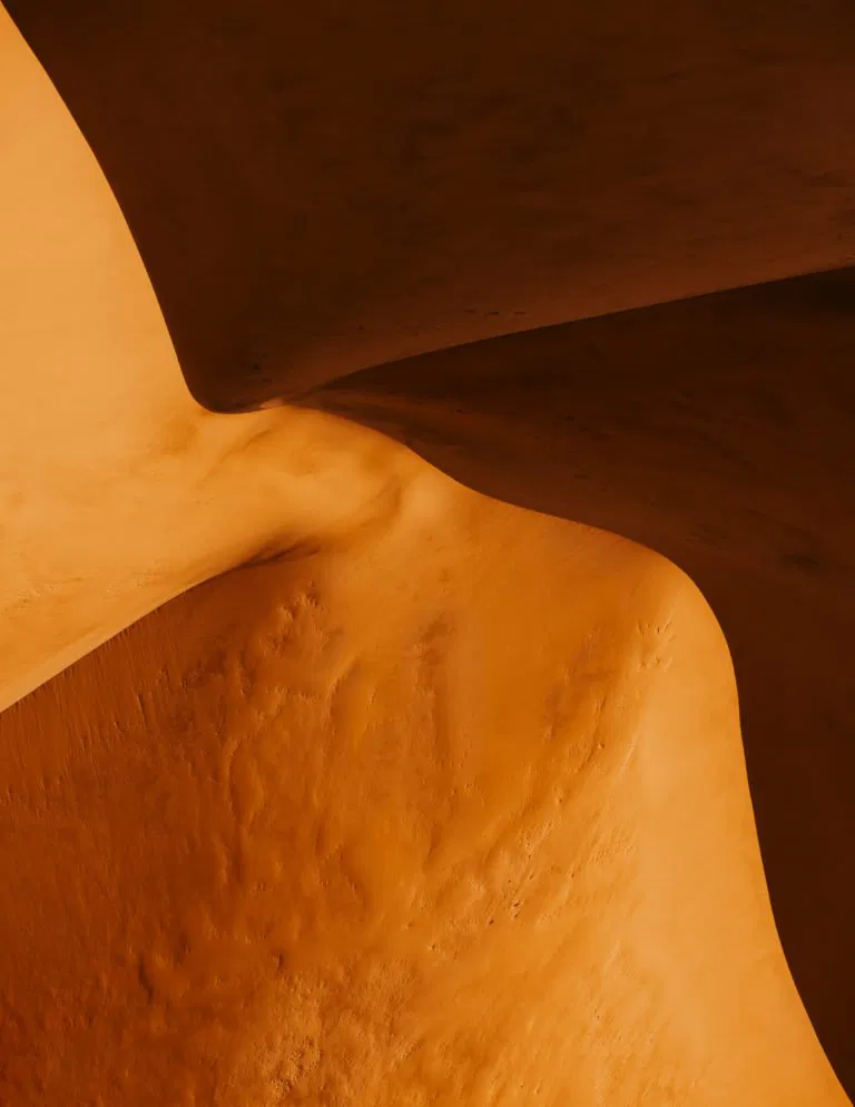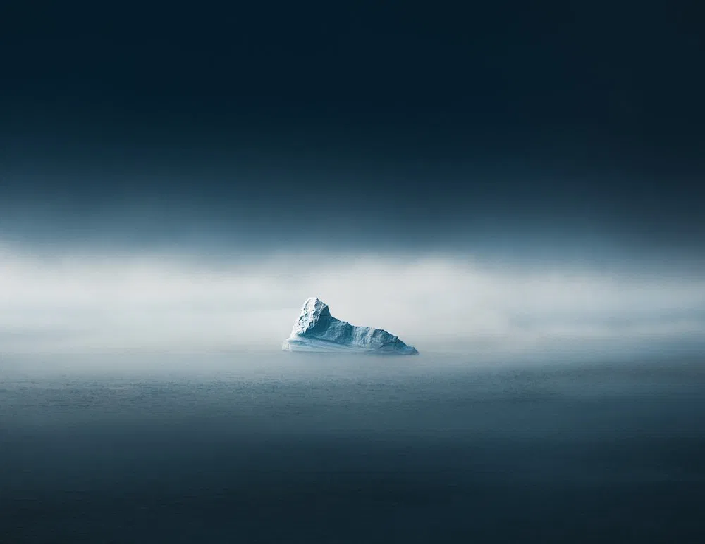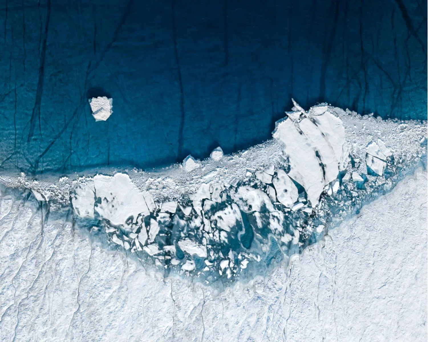 Salt ponds form tantalizing contours of bright tones, an aesthetic achieved because of the presence of microorganisms whose colour changes as the salinity of water increases; luminous orange pools (the result of chemical contamination), contrast with their shadowy surroundings in a German coal mine; whilst in the arctic, splintering sheets of ice form delicate patterns against the deep cerulean backdrop of the ocean.
