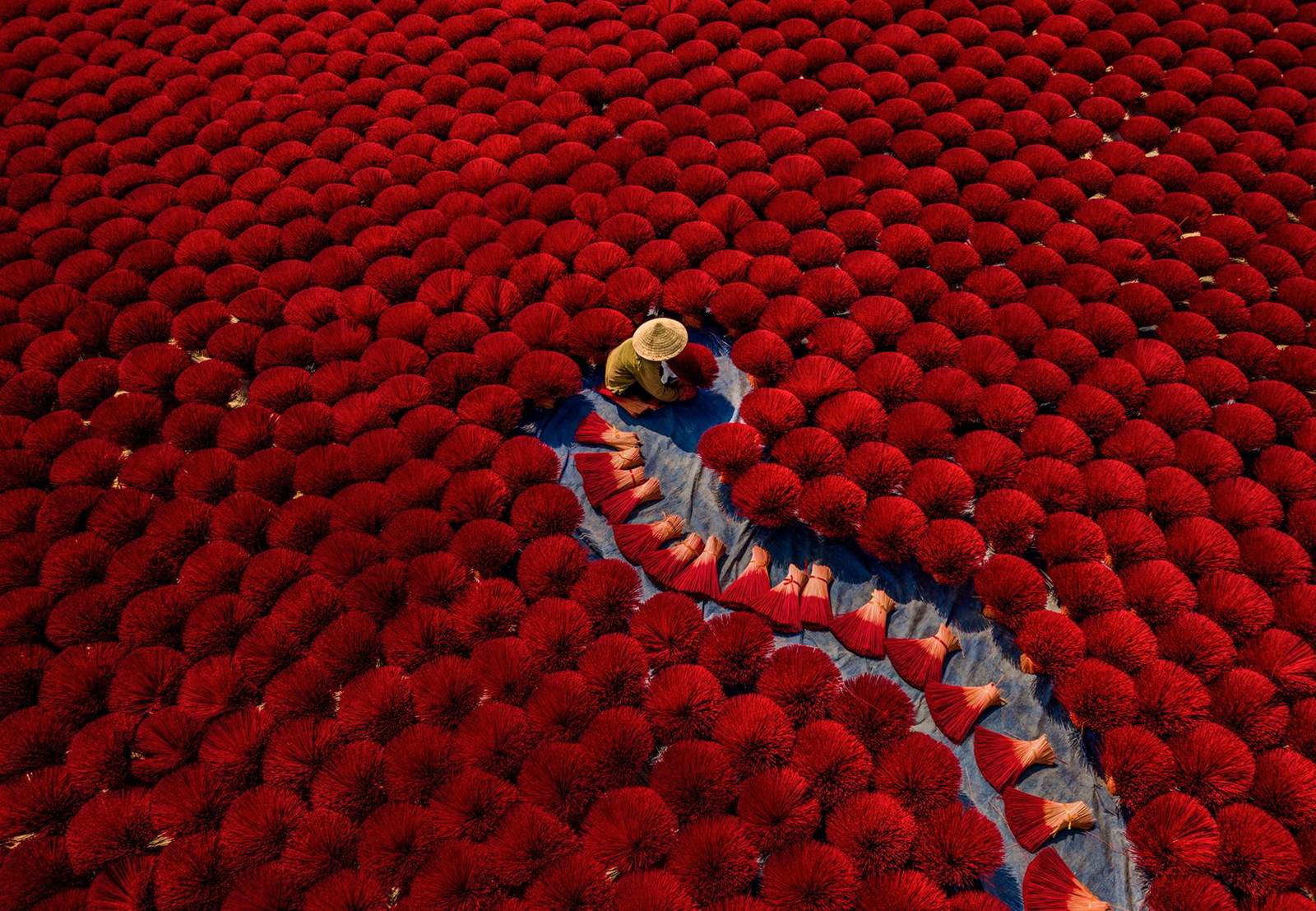 From the series “Vietnam from Above”, this stunning image by Khanh Phan-Thi captures a woman drying incense sticks dyed in a vivid red— a color symbolizing good luck. In Vietnamese culture, incense serves as a bridge between the living and the spirits, making it an essential part of daily rituals and traditions. Framed from an aerial perspective, the photograph beautifully showcases the worker’s dedication as she carefully gathers the crimson sticks into bundles. Her bowed head, reminiscent of someone in prayer, reflects the deep reverence for this timeless practice.