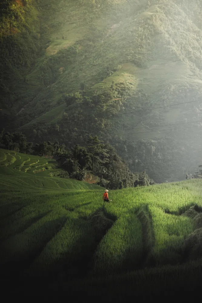 Rice is deeply woven into Vietnamese culture. According to folklore, the gods sent a messenger spirit to gift rice to humankind, and it has always been a fundamental part of daily life and a key export—Vietnam is the world’s third-largest rice exporter. The country’s lush, green rice fields have become an iconic symbol, beautifully portrayed here by Ben Glassco. The image captures a lone rice farmer strolling through the terraced fields, calling out to her fellow workers as they wrap up their day, with the late afternoon sun illuminating the verdant valley surroundings typical of the country’s northern regions.