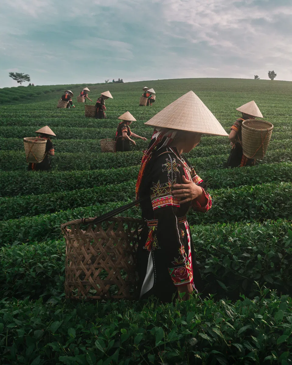 This stunning image, captured by Miami-based photographer Chris Ha, showcases the dedication of workers who hand-pick the leaves—an essential process for producing the finest teas. The workers, dressed in traditional attire and iconic conical hats, stand in contrast to the lush, green fields, bathed in soft afternoon light. The scene highlights the timeless connection between the people and the land, celebrating the cultural heritage and unwavering commitment behind this intricate craft.