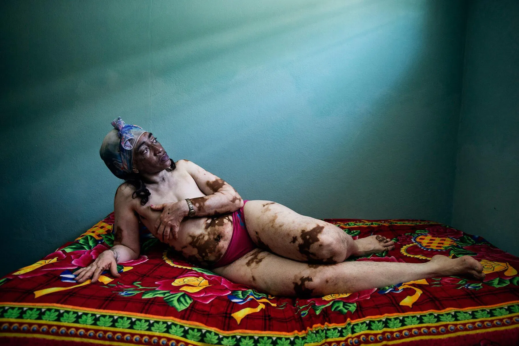 A triumph of light, color, and form, Mariniello‘s image exemplifies the artistic potential of portraiture. The rich, kaleidoscopic hues of the blanket, and by contrast, the subtler iteration of the backdrop, draw the eye to the protagonist who is illuminated beautifully by the angular natural light. Her reclined pose is perhaps a nod to the iconic paintings of the Goddess Venus by the masters of the Italian Renaissance (namely, Giorgione and Tiziano) and conveys strength and confidence befitting of her unique beauty.