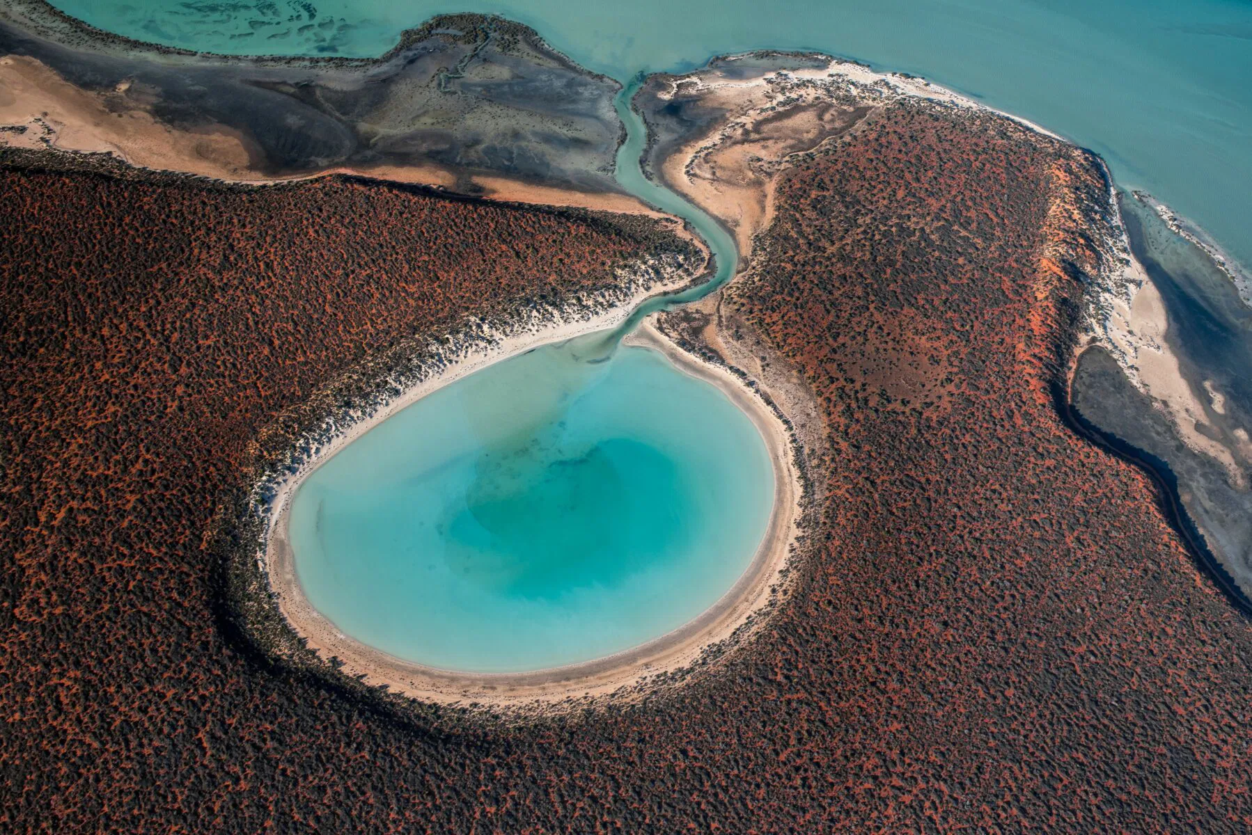 Ross Long’s aerial rendering depicts the aptly named “Little Lagoon”, which forms part of a larger lagoon system in the Shark Bay region of Western Australia. Cut off from the pernicious grasp of humankind, this compact ecosystem has thrived, and pullulates with a diversity of marine life: rays, sharks, and seahorses, to name but a few.