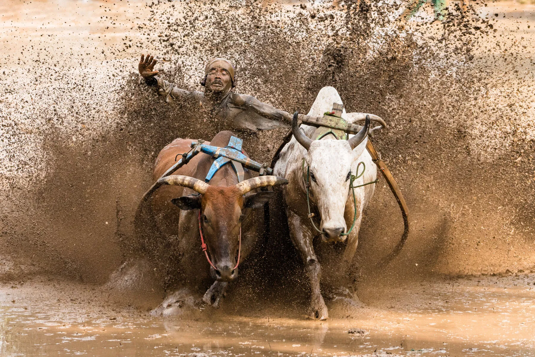 Perfectly-timed, and framed: the pair of bulls and their jockey are conspicuously centrally sets, bursting from a crescent-shaped, mirey, explosion. It arrests the viewer’s attention and communicates brilliantly the dynamism of the scene, rendering the viewer feeling that they are present, and demonstrating why the event has been dubbed ‘the muddiest race in the world’.