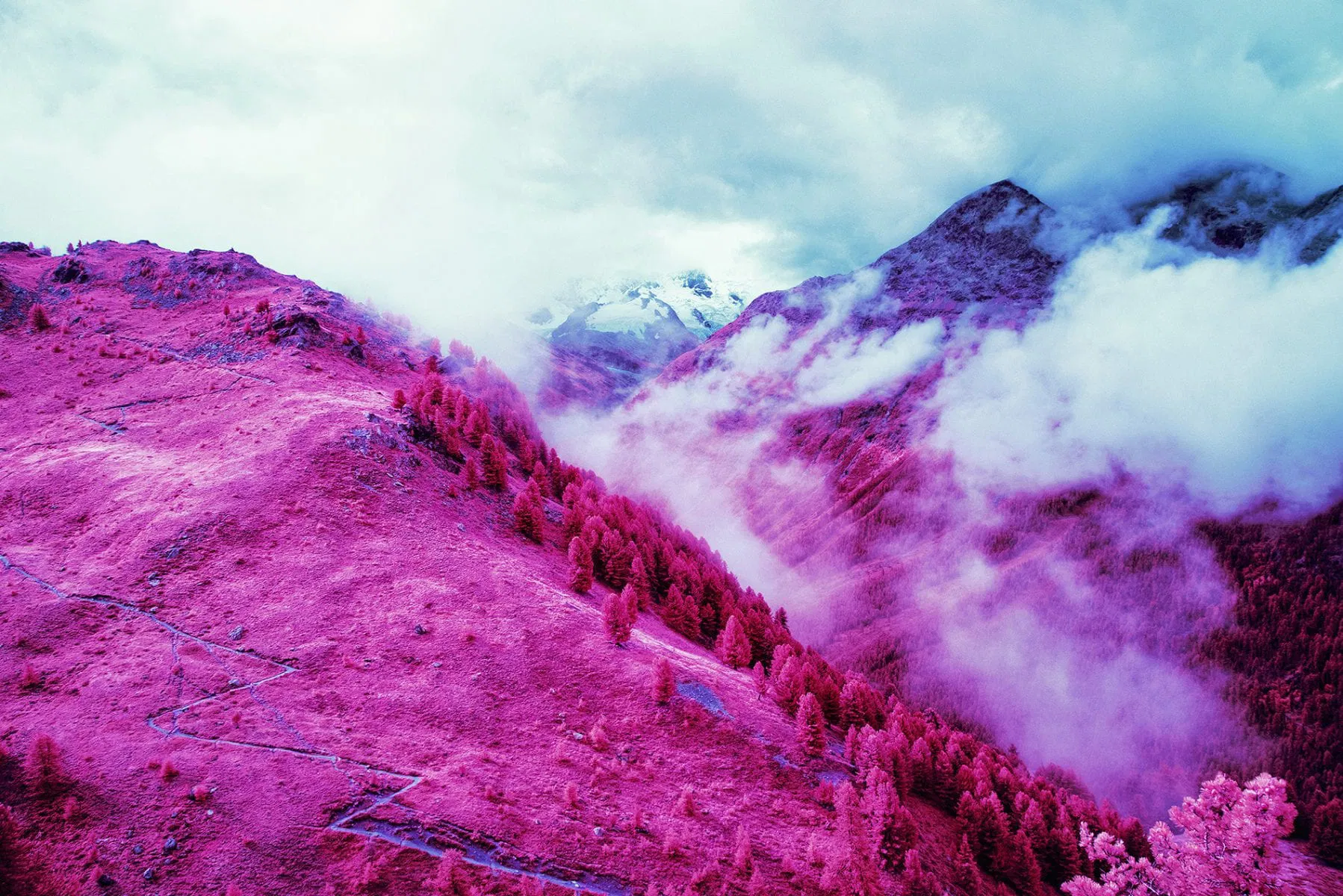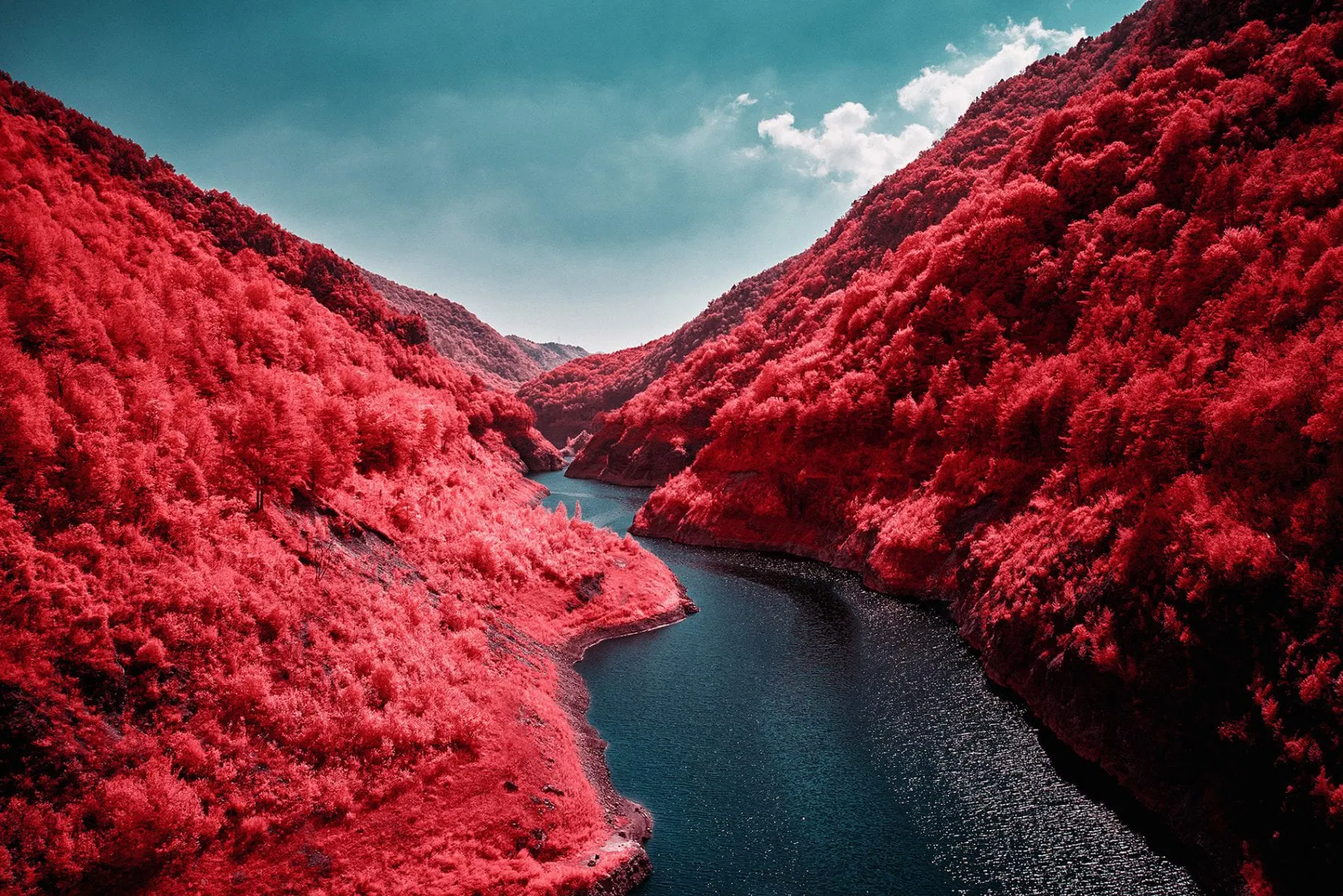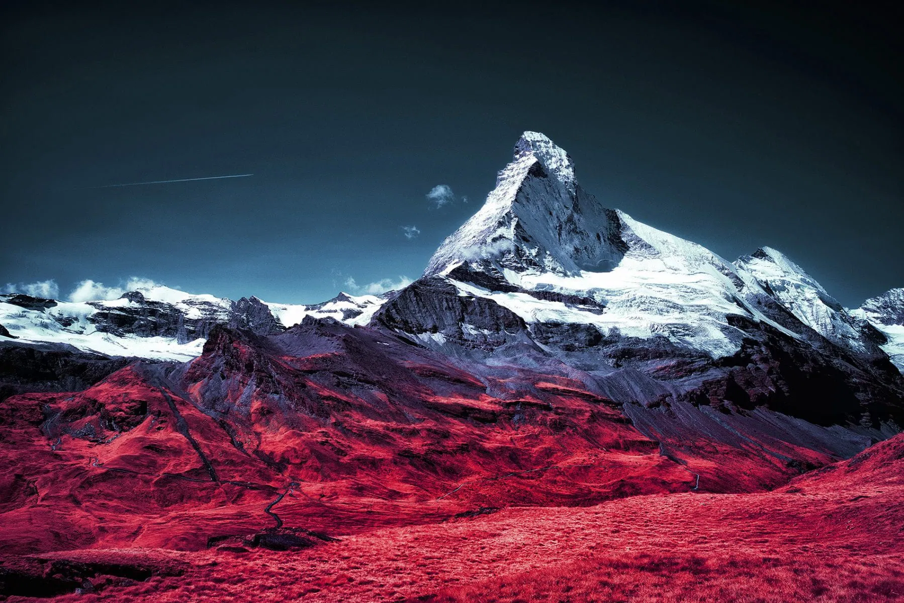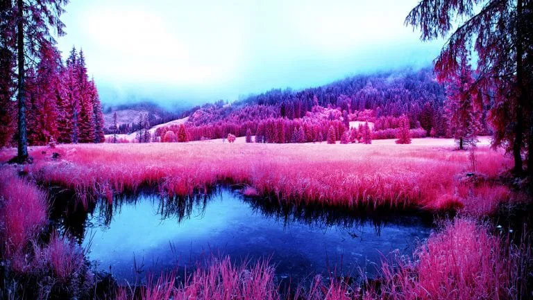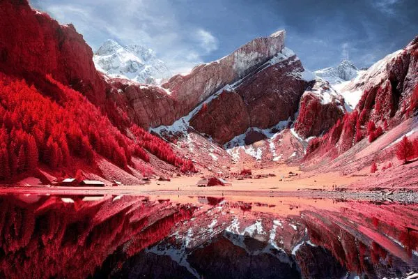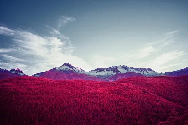 Now discontinued, Kodak Aerochrome films were first designed for use in aerial photography, with cartography and military applications. Aerochrome is sensitive to the entire visible spectrum of light in the same way as normal film, only difference is that its sensitivity is extended way beyond, into the invisible near infrared.
