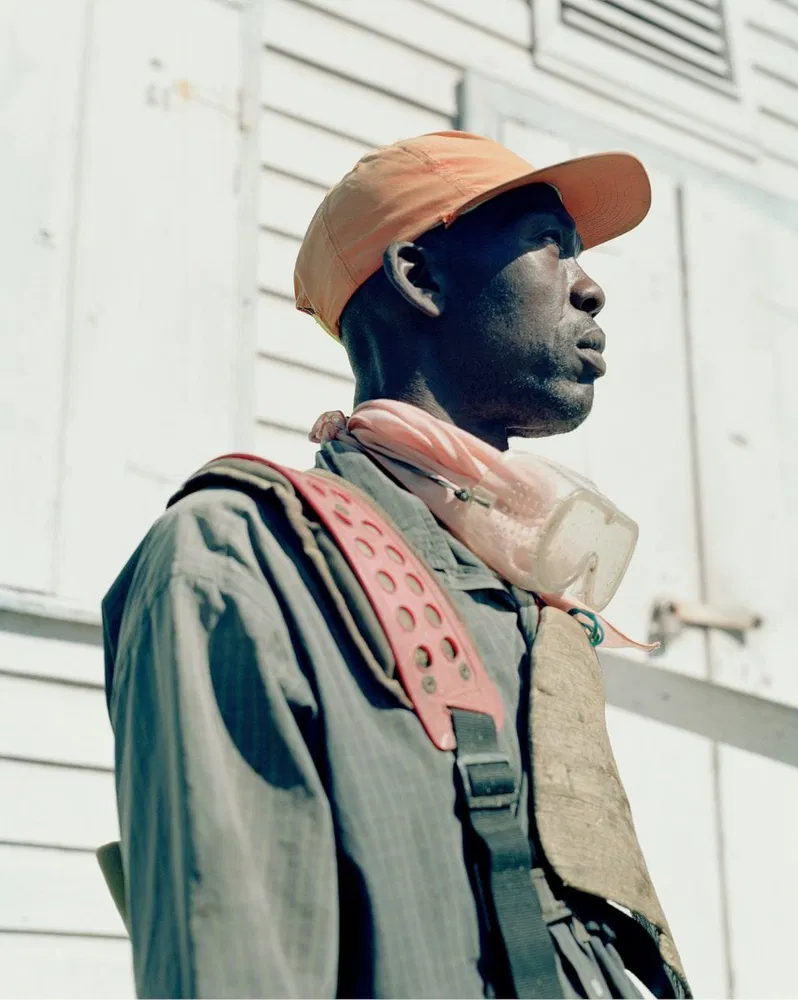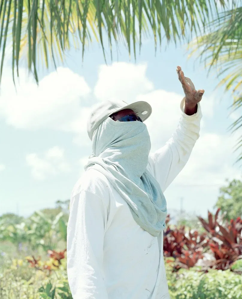 Catherine Hyland’s portraits from the Caribbean island of Nevis are very simple. The first shows a man standing in front of a timber house holding a petrol-powered strimmer. He’s wearing grey work-clothes to protect him from the flying grass, a rough-cut plastic apron covering his waist and thighs, shinguards and workboots protecting his feet and legs. This is a picture of a man who labours. Go forward a few pages and there is another portrait striking in its simplicity, another picture of a man who labours. This shows a man standing in the island’s hot Springs. The man is wearing only shorts. He’s well built in a muscular and well-fed sense, his face has an expression of weariness, his arms are smeared in white clay, perhaps from the springs.