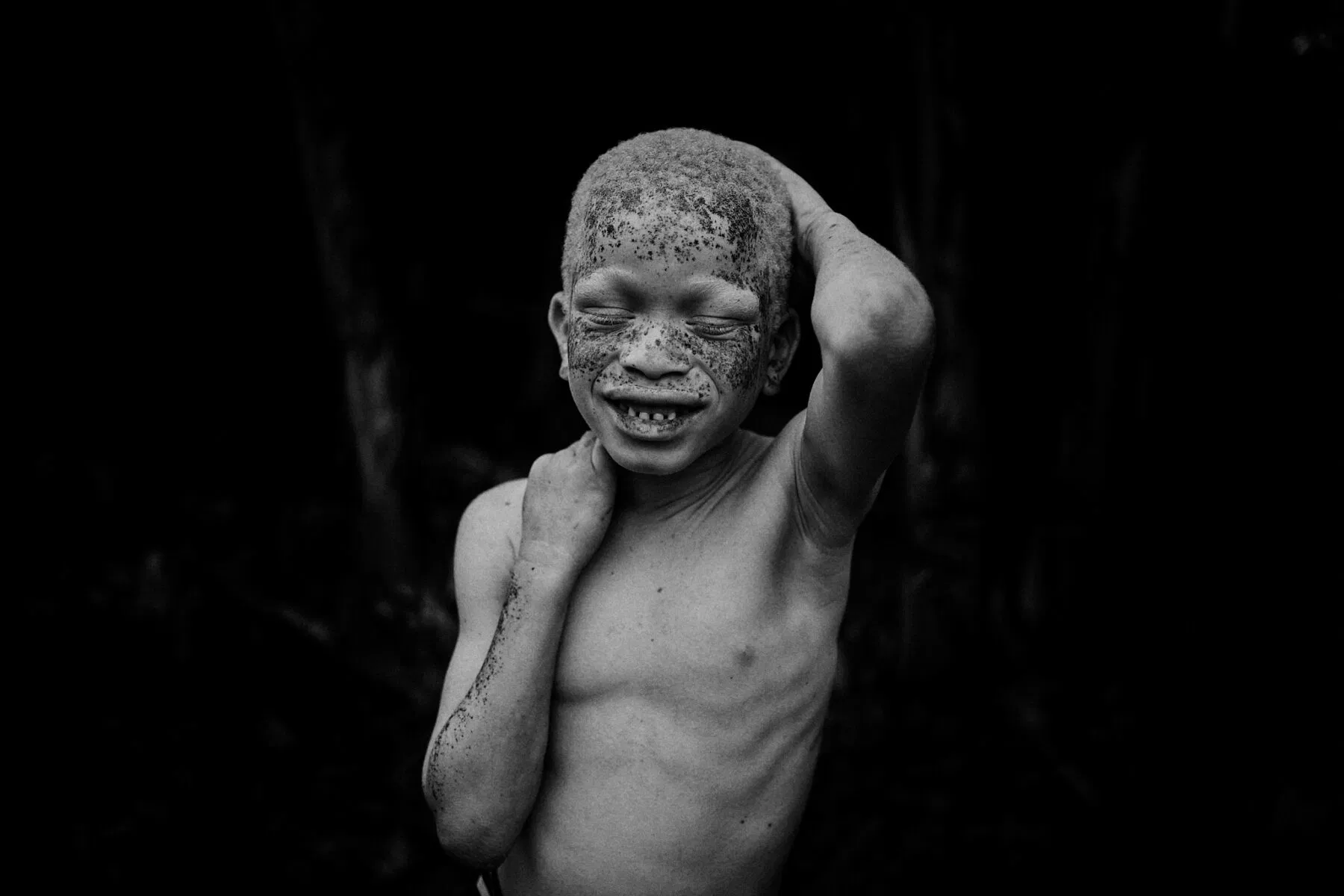 “A wonderful, intimate portrait that captures the joy of this young boy. Stripped of color, the photograph takes on a heightened emotional clarity: the contrast between his pale body and the inky shadows becomes more striking, amplifying the sense of vulnerability and resilience. Born with albinism—a condition that makes him especially visible in both body and social perception, and puts him at risk—here, his presence is rendered with tenderness and dignity, celebrated but not exoticized or objectified. It is a deeply human, unguarded moment: tender, dignified, and quietly heartwarming.”– The Independent Photographer Editors
