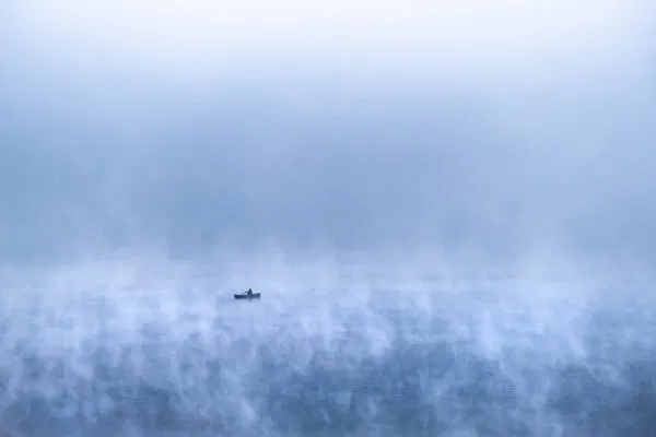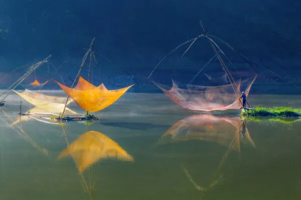 “I was drawn to the intense colours of this image. A simple act of the traditional craft of fishing is transformed into a spectacular cinematic scene by the morning light and brilliant hues. The fisherman to the right of the frame appears very small in comparison, as if dominated by nature.” – Caroline Hunter