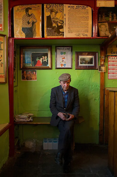 爱尔兰的酒吧文化充满传奇色彩,位于丁格尔等偏远城镇的传统酒吧仍然是社区的心脏。在这幅肖像中, 理查德森 捕捉到了一个更加令人深思的时刻:一位孤独的顾客背靠着一面绿墙,周围环绕着仍然存在于这个国家安静角落的过去的试金石。